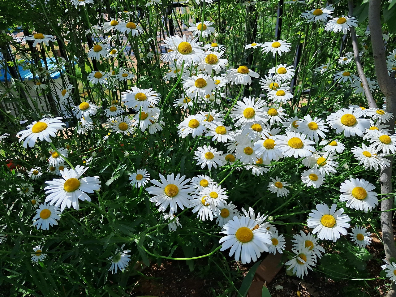 집에도 샤스타데이지를 심었다. 작년에 한 포기 사서 심은 것이 얼마나 번식이 잘 되는지 잔뜩 늘어나서 서쪽 화단을 하얗게 장식하였다.