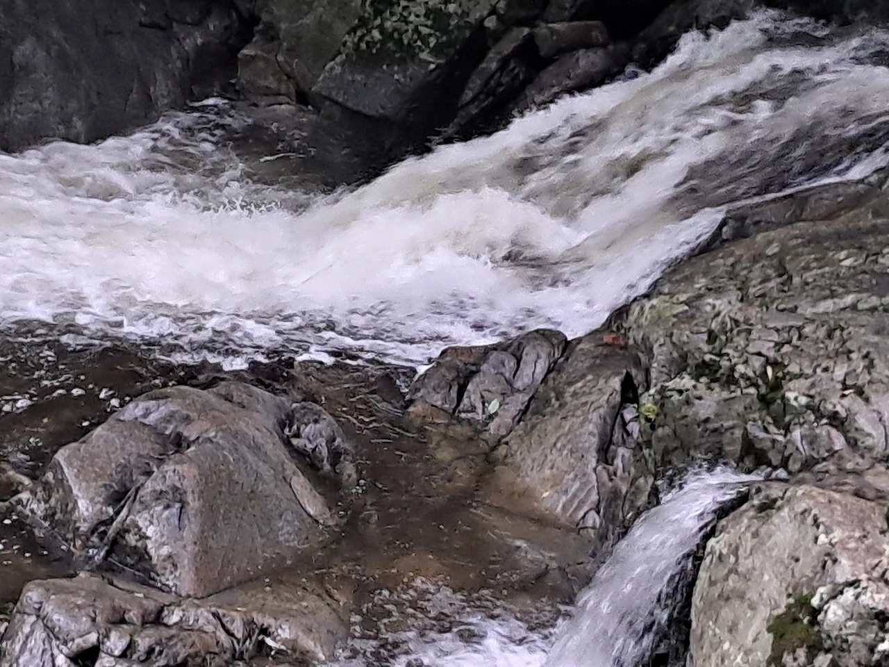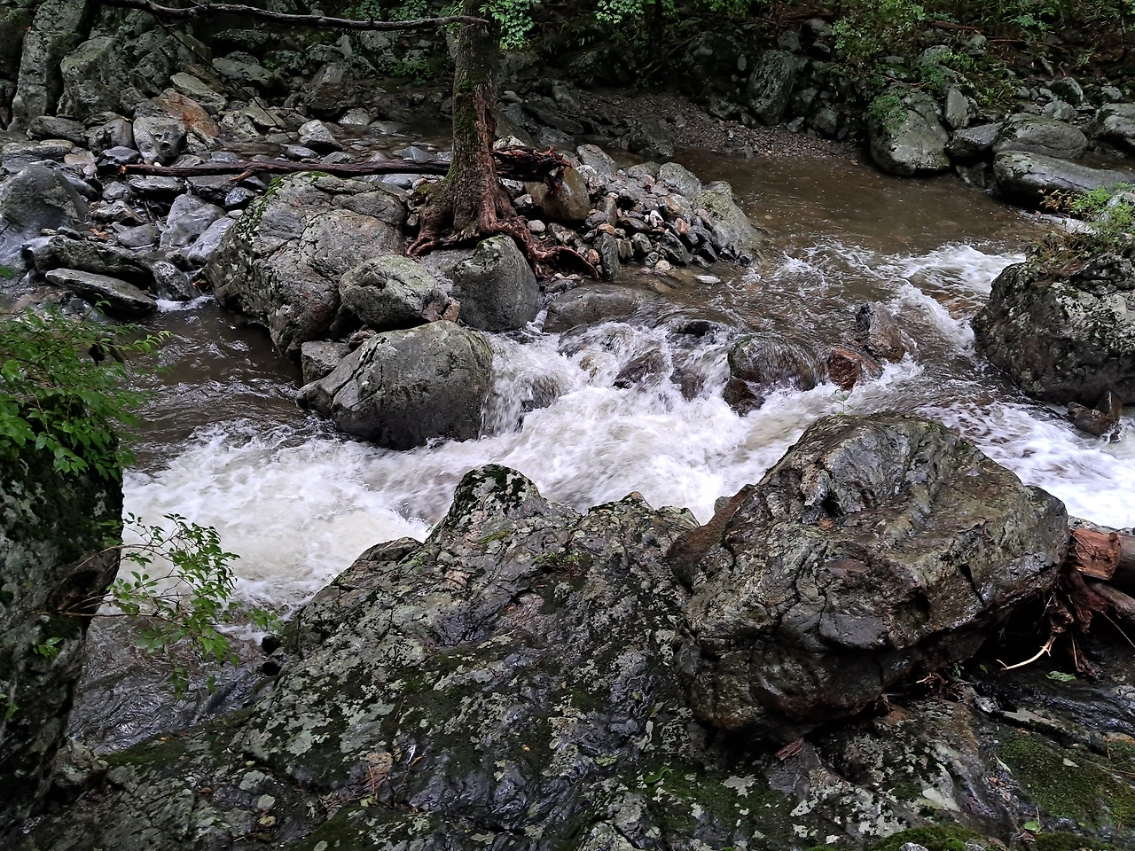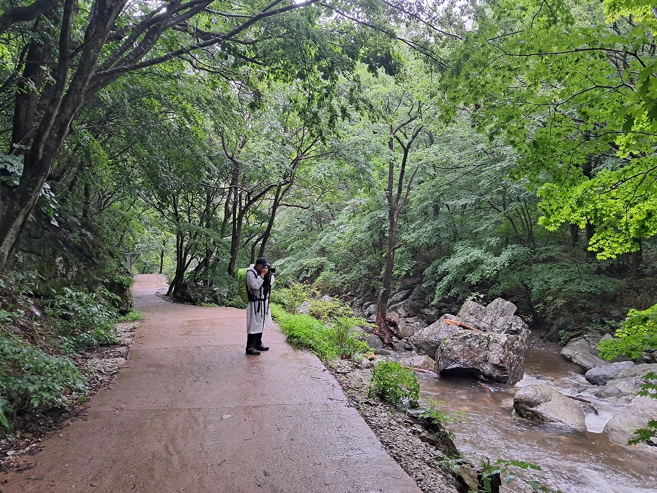 아침에 출발할 때만 해도 덕유산 소나기 5~60mm 예보를 비 조금 오다 그치는 정도로 해석했다. 우리 편한 대로~ 아침 7시 20분쯤 양평을 떠나 덕유산 무주리조트 곤돌라 주차장에 도착한 것이 9시 50분. 설천봉에 구름이 많아서 전망 보기가 힘들 거라는 방송을 들으며 곤돌라 편도 탑승권을 발권했다. 곤돌라를 타고 올라갈 때는 생각보다 시야가 좋았다. 내려서도 구름의 양이 많아서 전망이 잘 안 보일 뿐 비에 대한 걱정은 하지 않았다. 여름에는 소나기가 갑자기 내리기도 하는 것이 산악 날씨라 보험처럼 우비를 들고 다닌다. 그 보험을 오늘 탄 것이다. 남편이 1시와 2시 사이에 소나기 예보가 있다고 했다. 비의 양은 그리 많지 않을 거라고~ 잘 하면 어려운 코스를 지나고 오수자굴에 닿을 때쯤 비가 잠깐 올 수도 있으리라 생각했다. 중봉을 지나 오수자 굴 쪽으로 하산하는 등산로는 그렇게 쉬운 코스가 아니기 때문에 도중에 비를 만나지 않는 것이 좋았다. 하지만 12시 반이 지났을 때쯤 비가 떨어지기 시작하더니~ 굵은 빗줄기가 사정없이 땅으로 내려꽂힌다. 잠깐 오고 말겠지 하고 그냥 가려다가, 아무래도 금방 끝날 비 같지가 않아서, 보험처럼 들고다니던 우비를 꺼내 입기로 했다. 탁월한 선택이었다! 그 뒤로 세 시간 정도 조금 약해지기도 했지만, 대부분 장대비라고 표현할 만큼 쏟아지는 비 속에 우중 산행을 하게 되었다. 출발할 때 끈이 달린 모자(바람이 심하게 불 때 사용)를 두고, 캡을 가지고 온 것이 얼마나 다행이었는지. 우비 모자가 얼굴을 가리지 않게 하려면 모자의 캡이 필요했기 때문이다. 카메라도 배낭 속으로 집어넣었다. 세 시간 동안 사진이라고는 오수자 굴 몇 컷뿐. 오로지 걷기만 했다. 미끄러운 경사로, 물탕이 된 등산로에 조심조심. 또 우비 밑으로는 무방비라, 숲속을 걷기 때문에 긴 바지를 입고 온 것이 완전히 젖어서 다리를 휘감아 달라붙었다. 비가 와서 기온은 조금 내려갔지만 우비 속이라 온몸은 습기인지 땀인지 젖어가고~ 신은 지 몇 년이 되어 방수 기능이 떨어진 등산화 틈새로 물이 새어 들어왔는지 질퍽거리는 느낌이다. 극기훈련이 따로 없었다. 중봉에서 백련사까지는 4.2km. 그 구간의 대부분을 우중 산행을 한 것이다. 우리와 같은 코스로 산행 중에 만난 팀은 딱 두 팀. 둘 다 우리처럼 부부 산행객이었다. 백련사 일주문에서 잠시 휴식을 취하면서 양말을 벗어서 짜 보았더니 물이 제법 나온다. 이렇게 많은 비가 오는 우중 산행은 세 번째. 그중에서도 가장 비가 많이 온 날이다. 덕유산 국립공원 탐방 안내소로 나오니 입산통제란다. 하산하는 사람들 외에는 아무도 출입을 허락하지 않는 것이다. 산 아래도 비가 많이 온 모양이다. 우중 산행은 아무래도 에너지를 더 쓰게 되고 그래서 피로를 더 느끼게 된다. 휴양림에서 저녁을 먹고 블로그에 우중 산행글을 쓰고는 바로 잤다. 두고두고 이야기할 추억 거리가 또하나 생겼다. 아래 사진들은 내가 휴대폰으로 찍은 것이다.