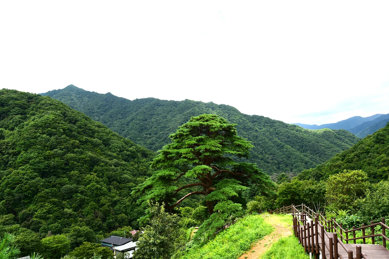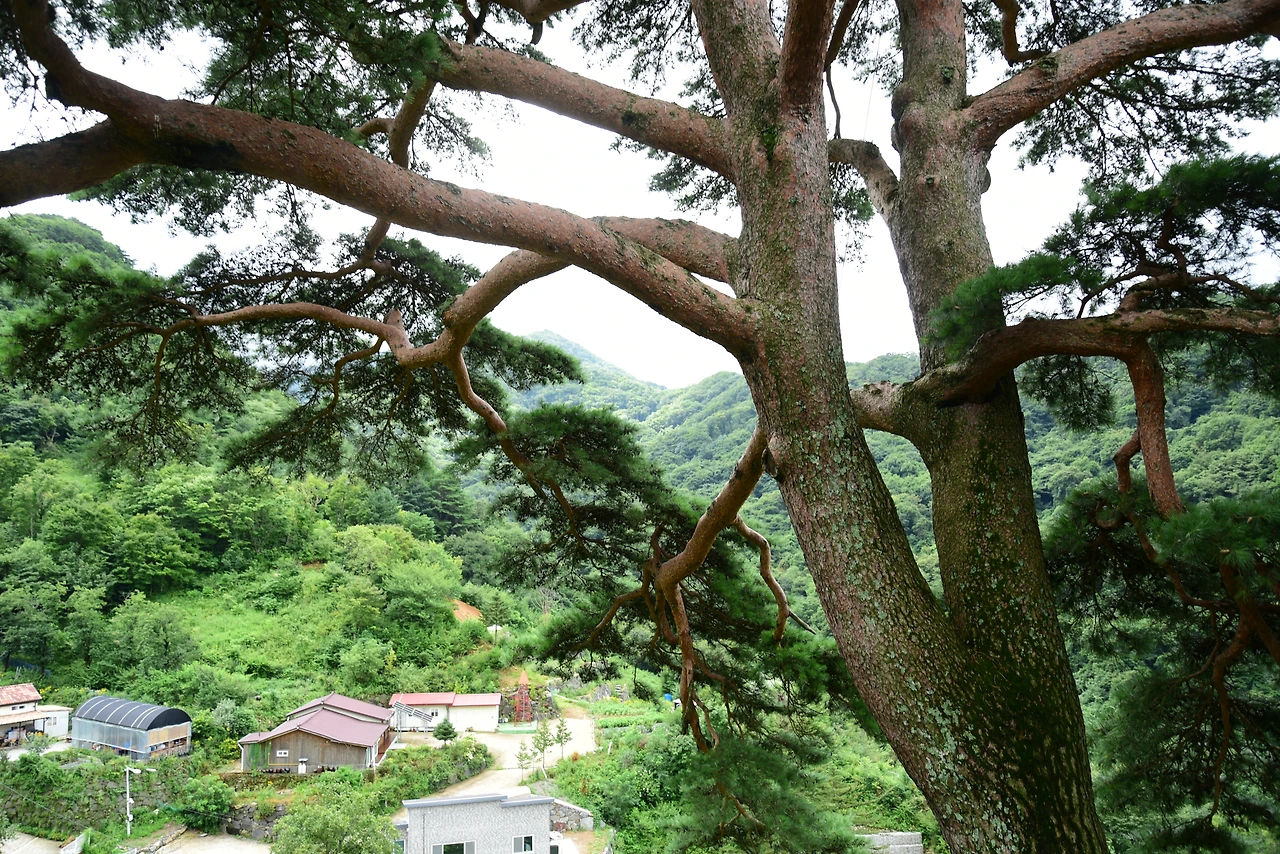 와운천년송은 할머니 소나무이며 할아버지 소나무가 또 있었다. 두 나무를 한 장에 담기 위해 마을에서 위를 향해 찍어보았다.