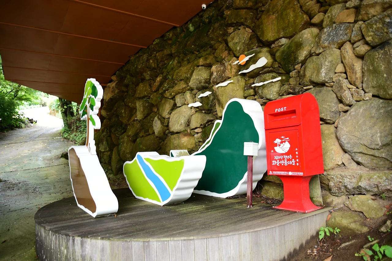 와운천년송 조형물과 빨간 우체통이 잘 어울린다.