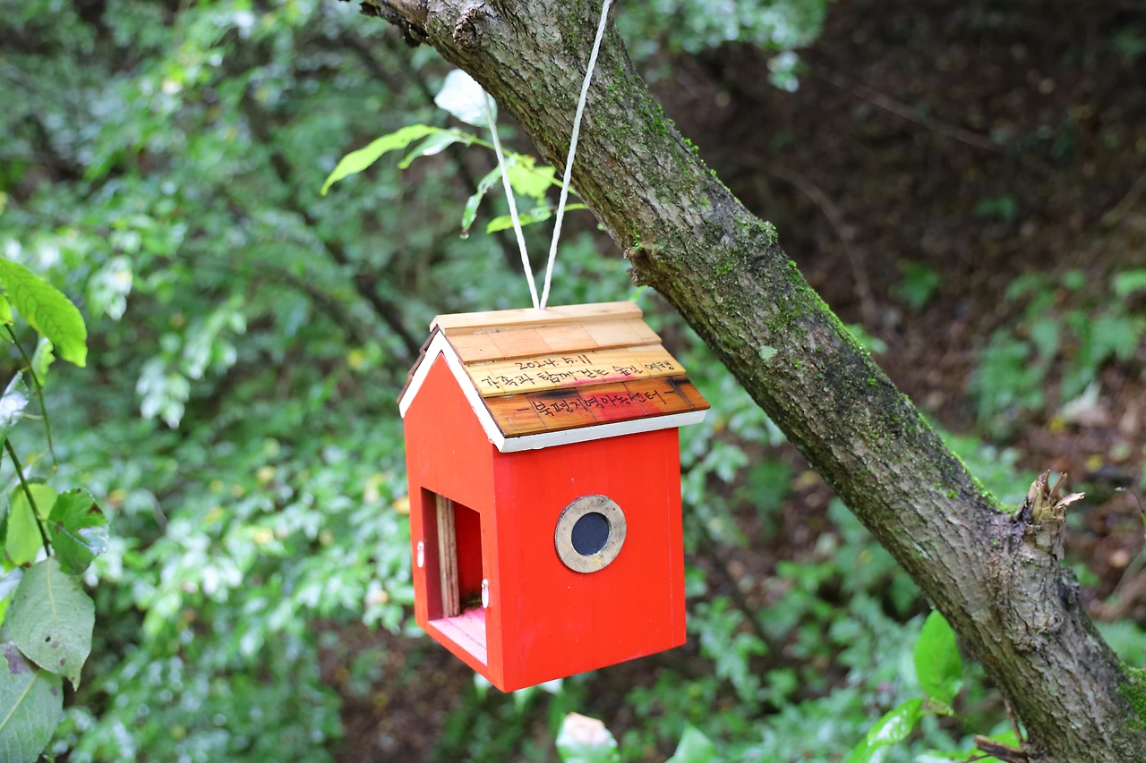 가족과 함께 걷는 숲길 여행 체험활동을 하면서 만든 새집들이 여러 군데 달려있었다.