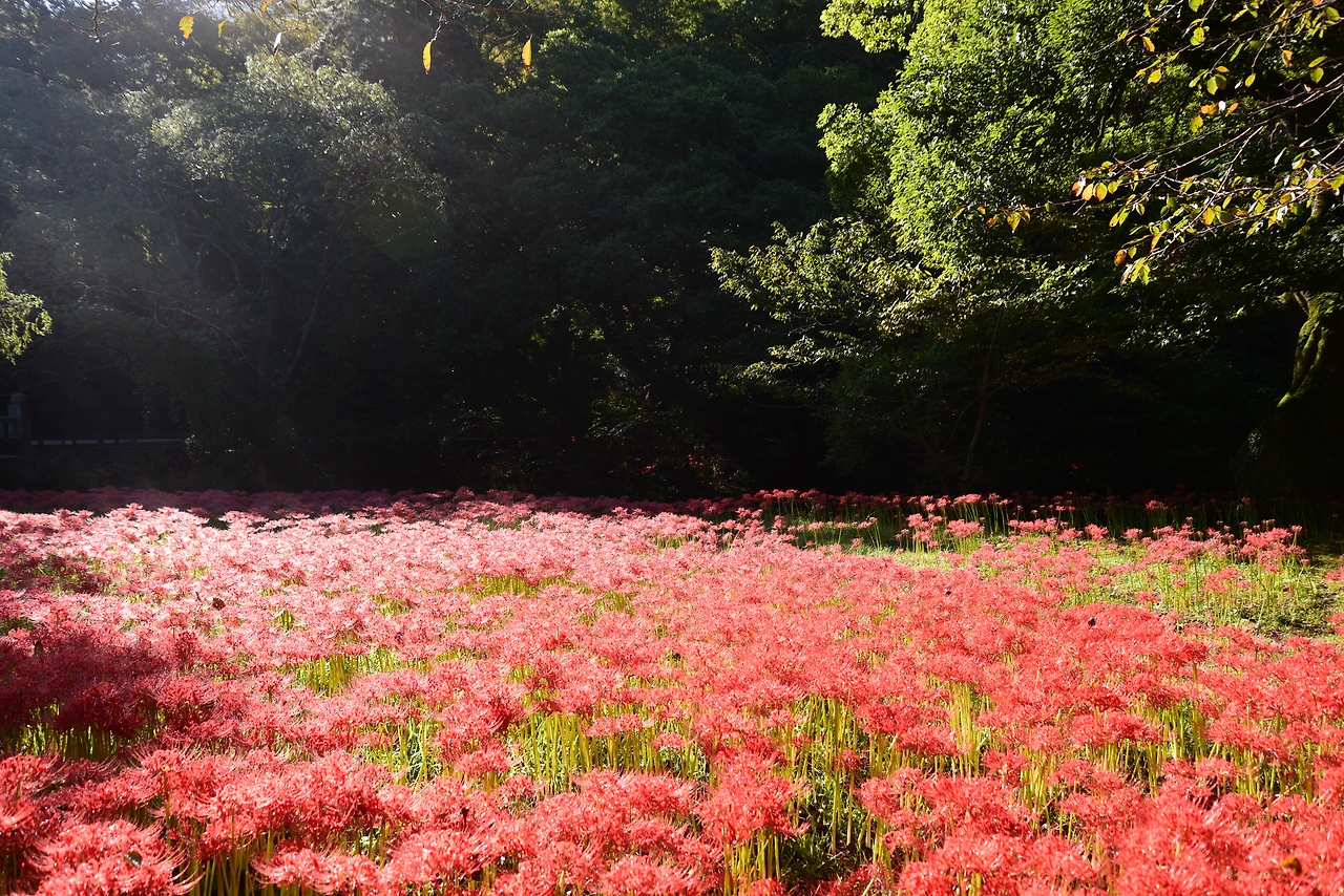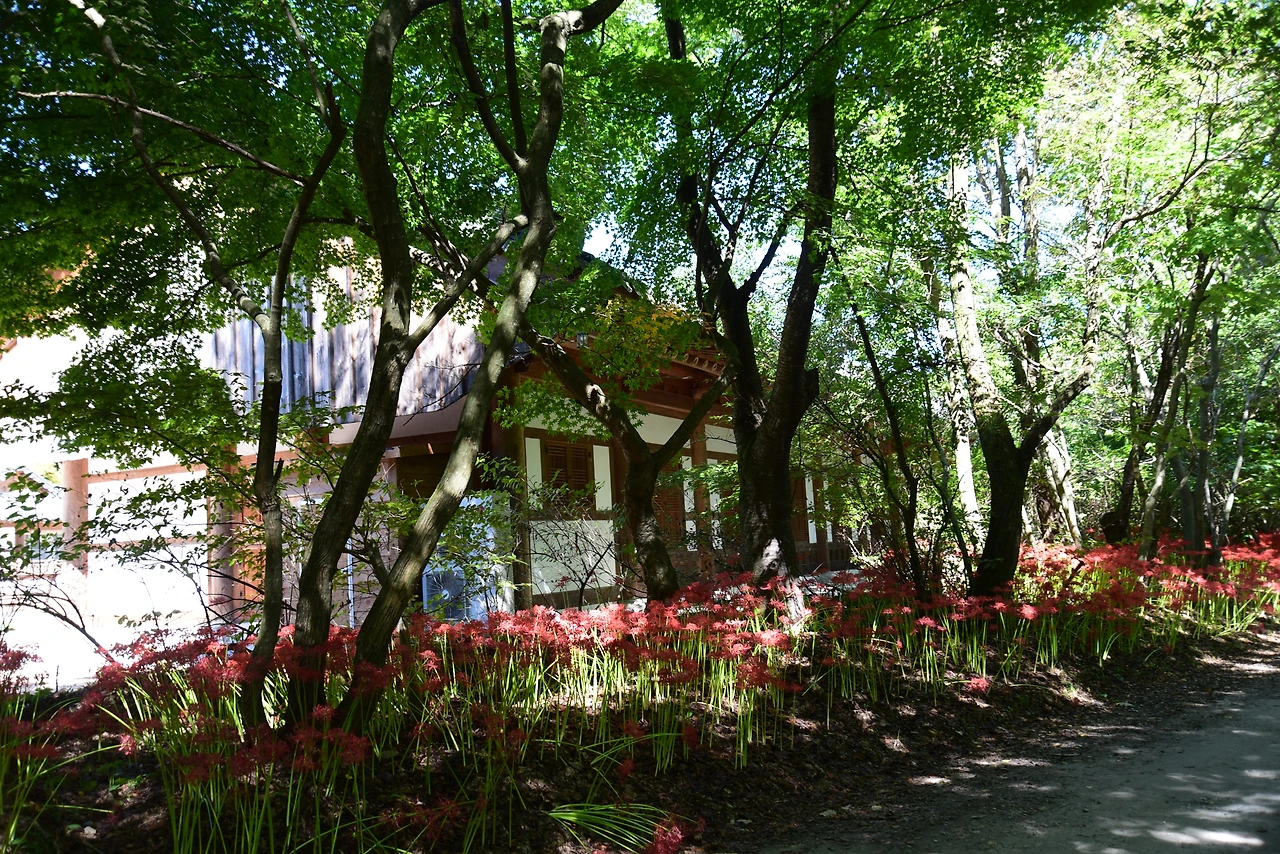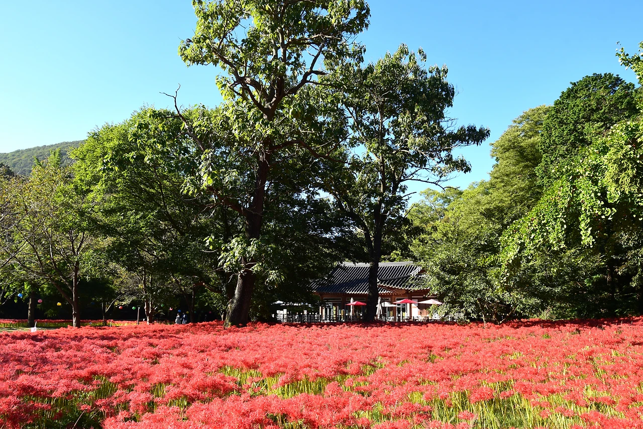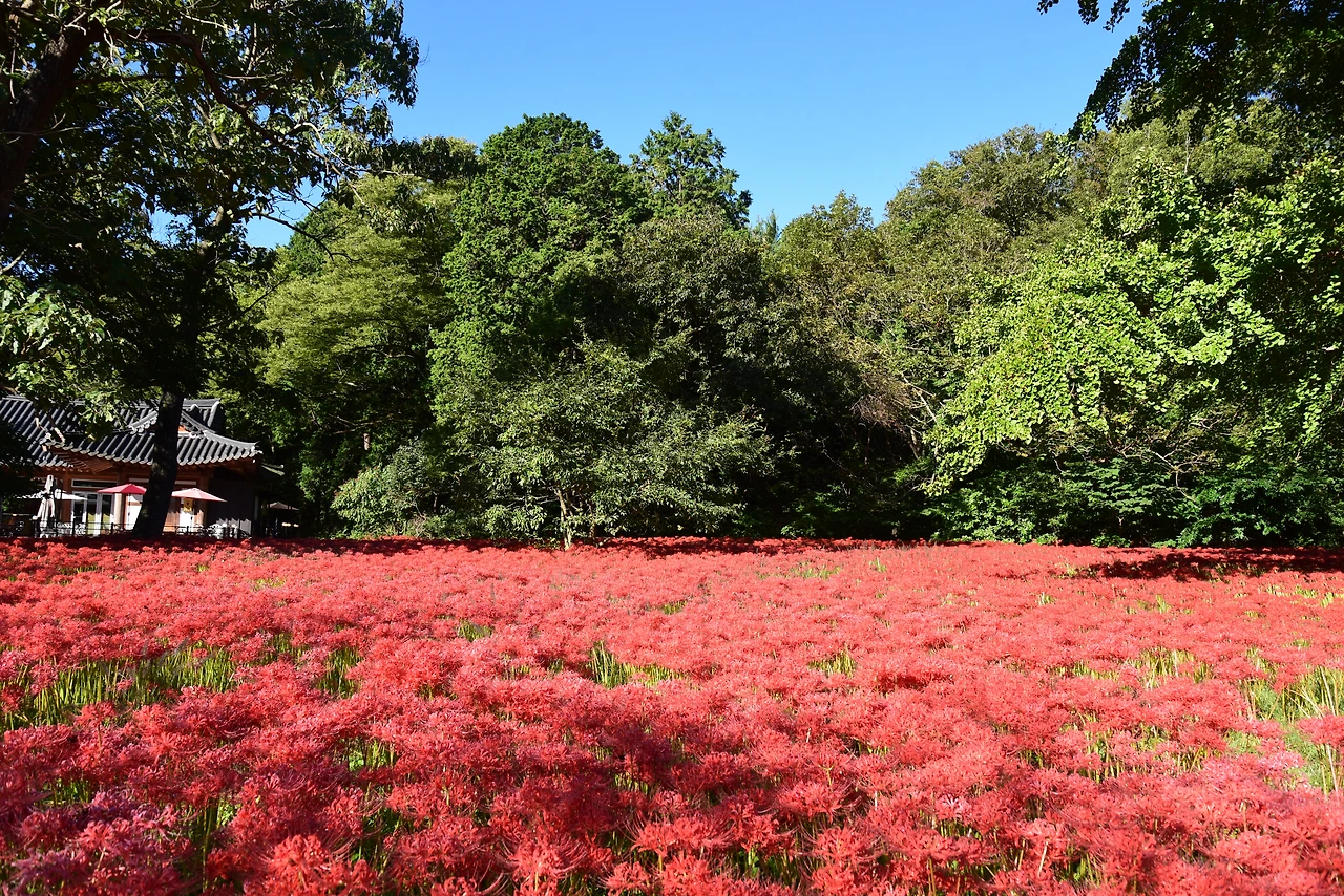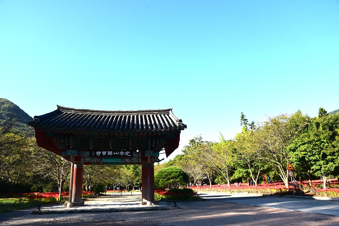 일주문 양쪽으로 꽃무릇 꽃밭이 넓게 펼쳐져 있다.