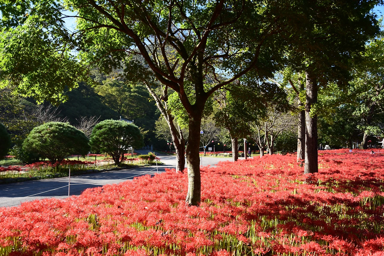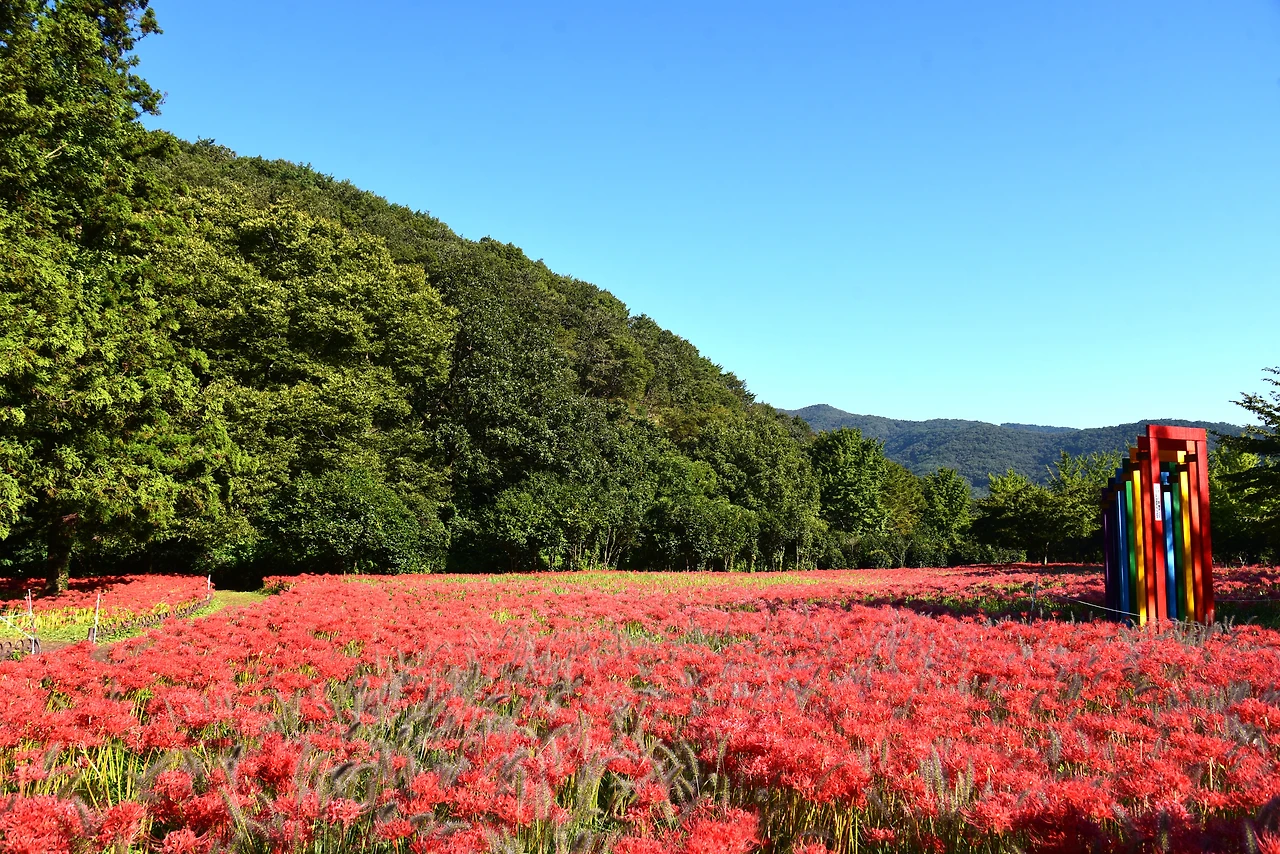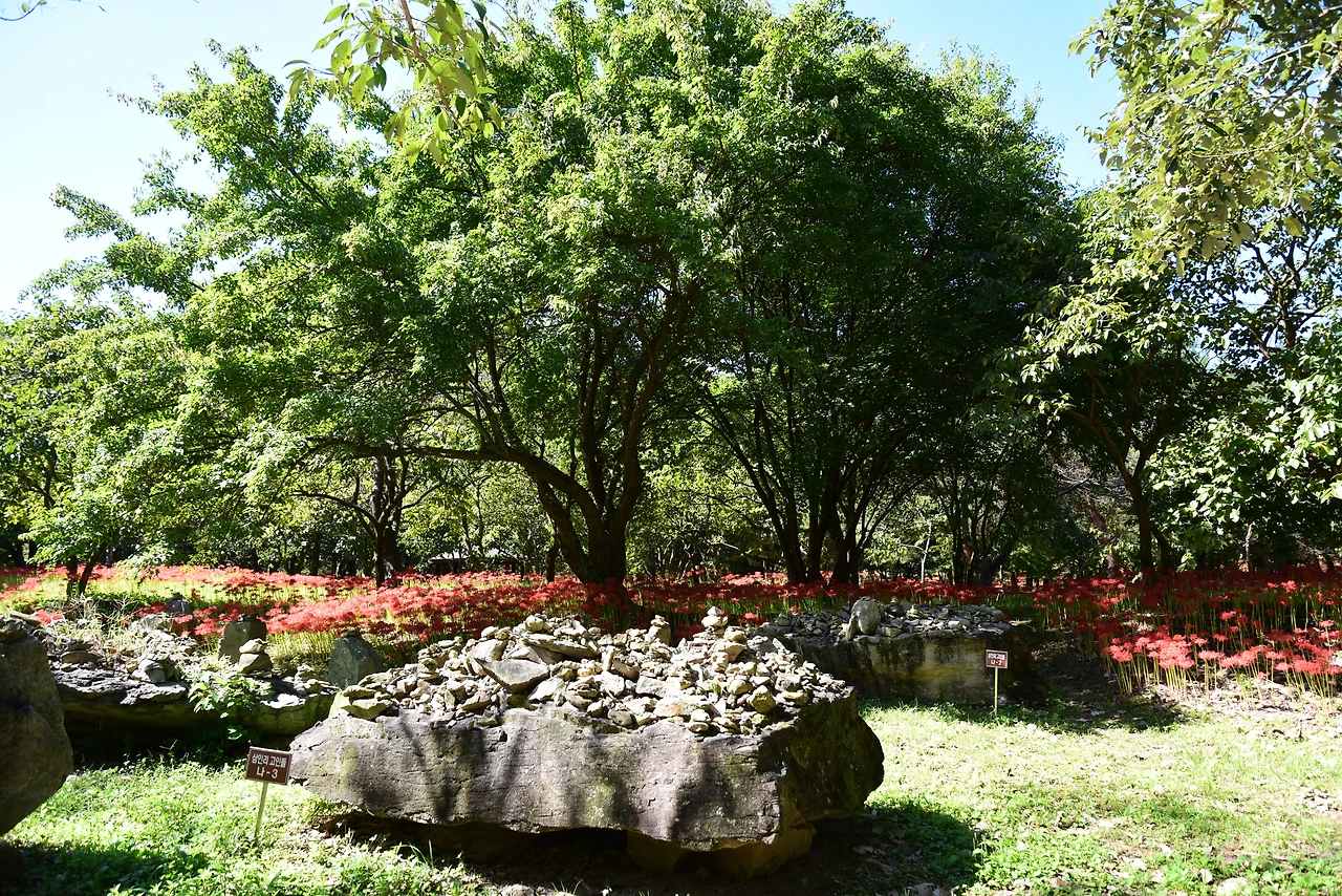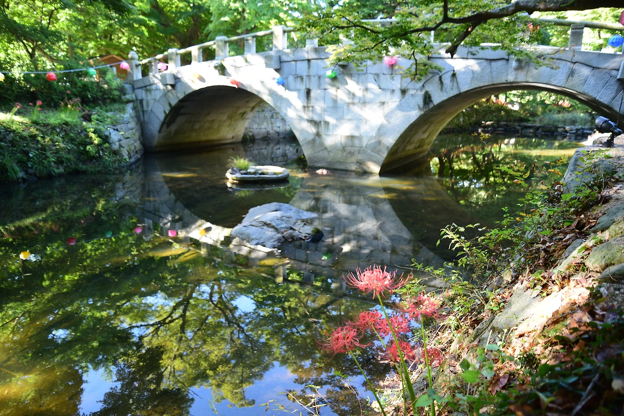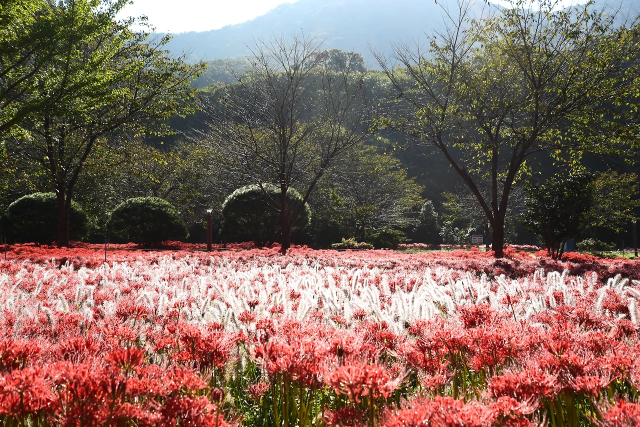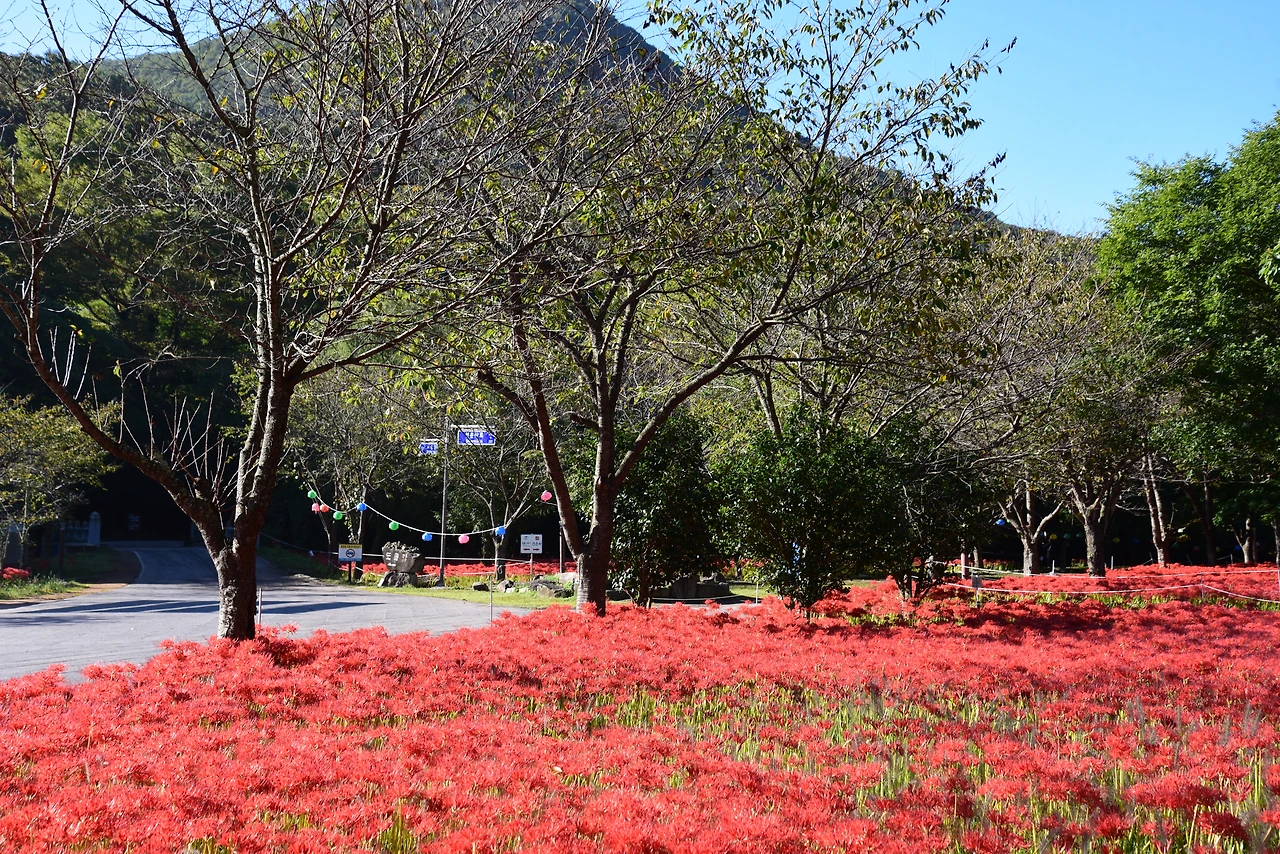 일주문 양쪽으로 꽃무릇 꽃밭이 넓게 펼쳐져 있다.