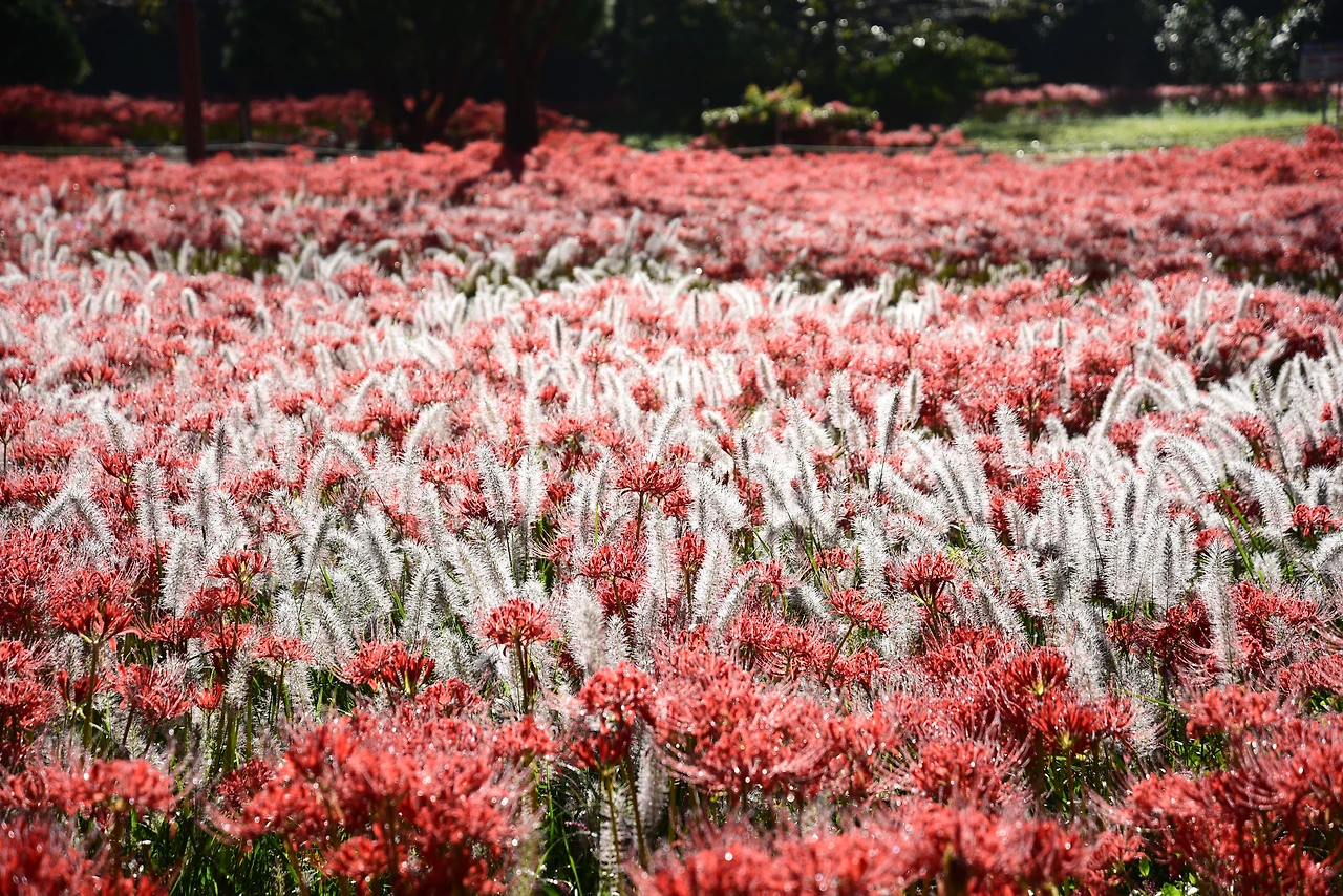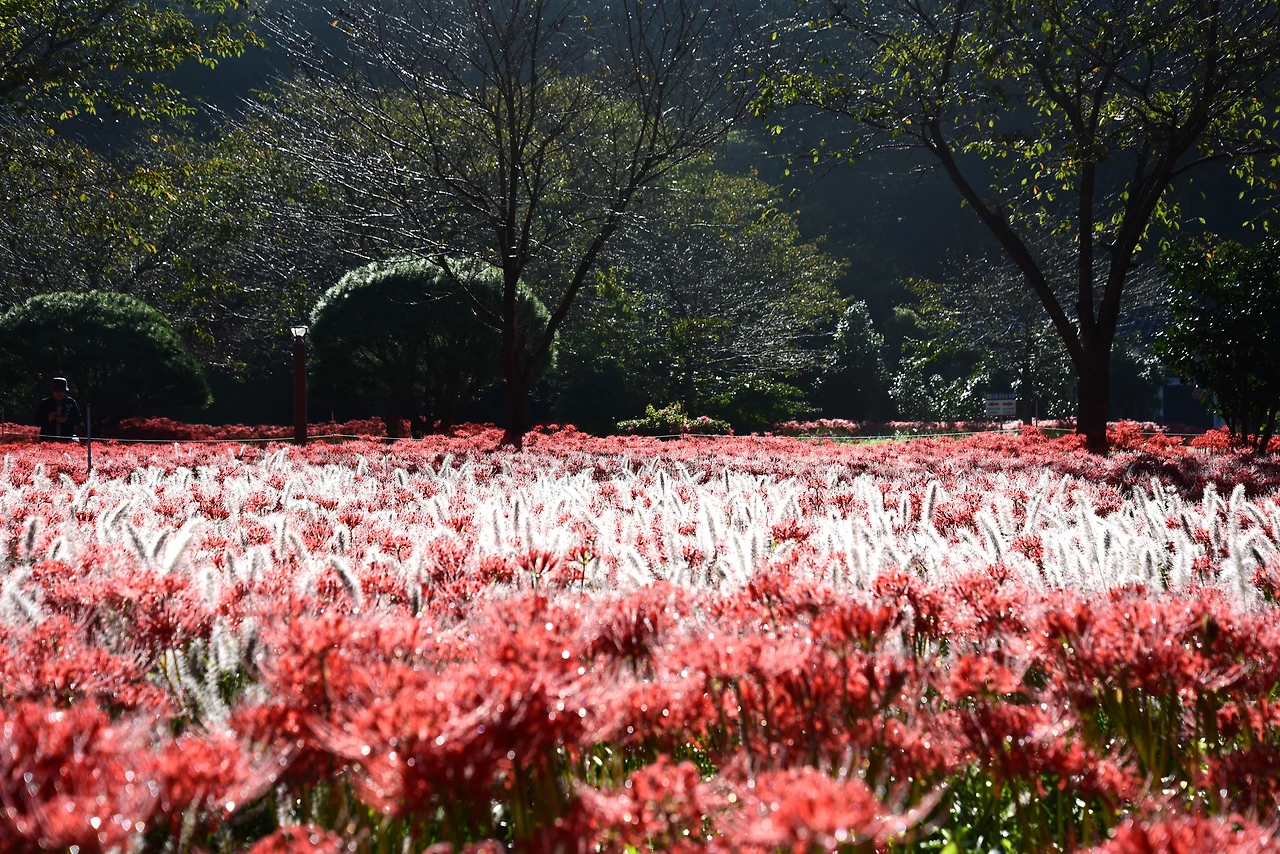 섞어서 심어놓은 그라스가 이슬에 젖어 하얗게 빛이 난다. 이슬 젖은 꽃무릇과 어울려 환상적인 분위기를 연출해 낸다. 해가 떠서 더워지면 곧 사라질 귀한 풍경이다.