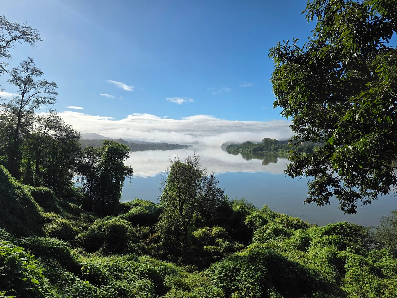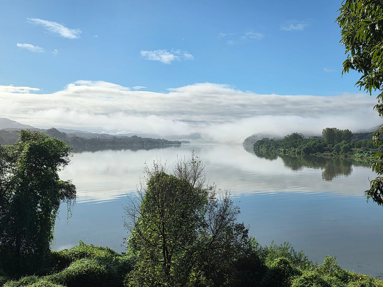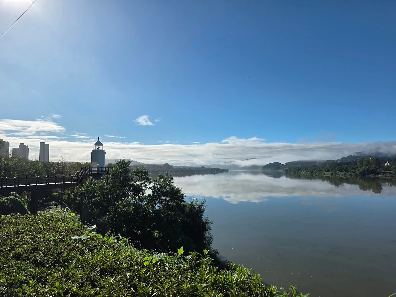 하늘의 구름과 경계면의 안개와 물에 비친 구름이 연결되어 멋진 풍경을 만들어 내어서~