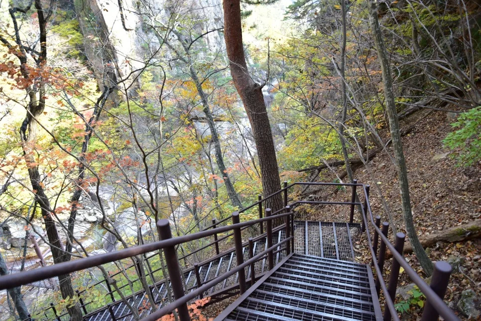 용소폭포 삼거리에 도착했습니다. 예전과는 달리 낙석 위험지역을 피해서 계단이 많은 새로운 탐방로를 설치했네요.