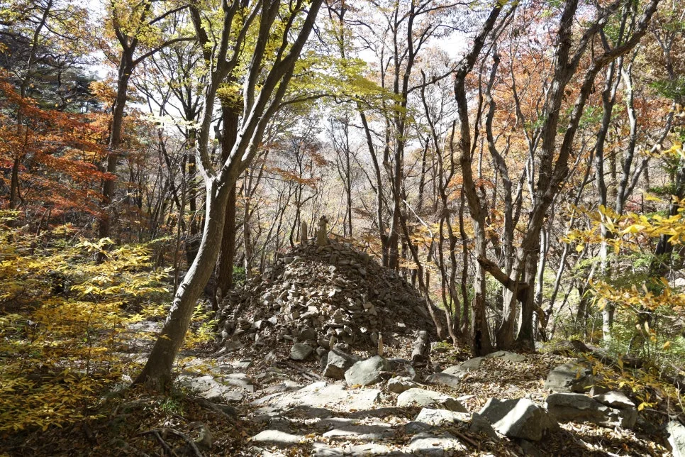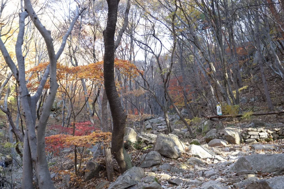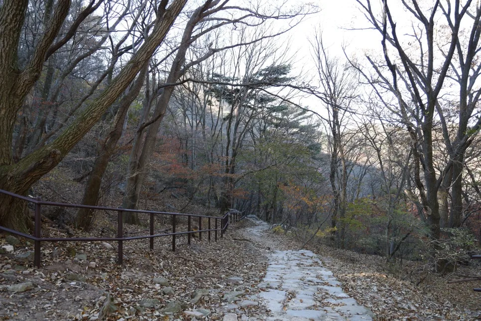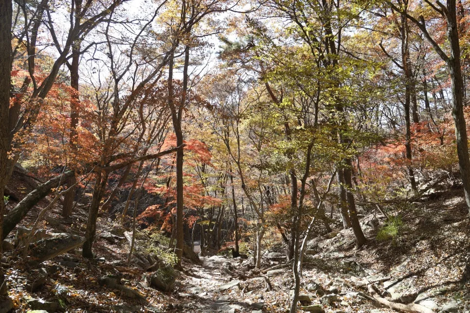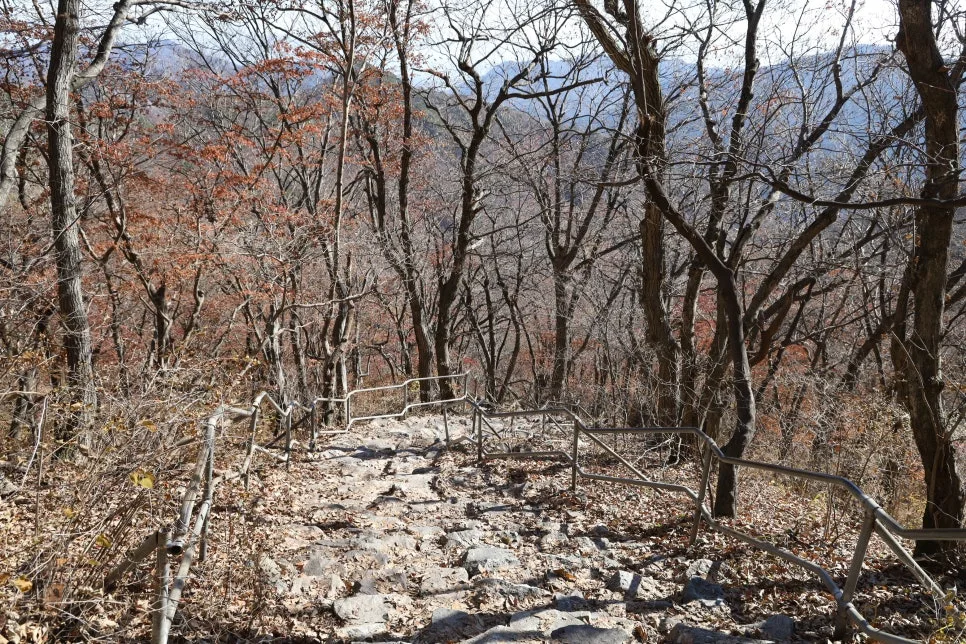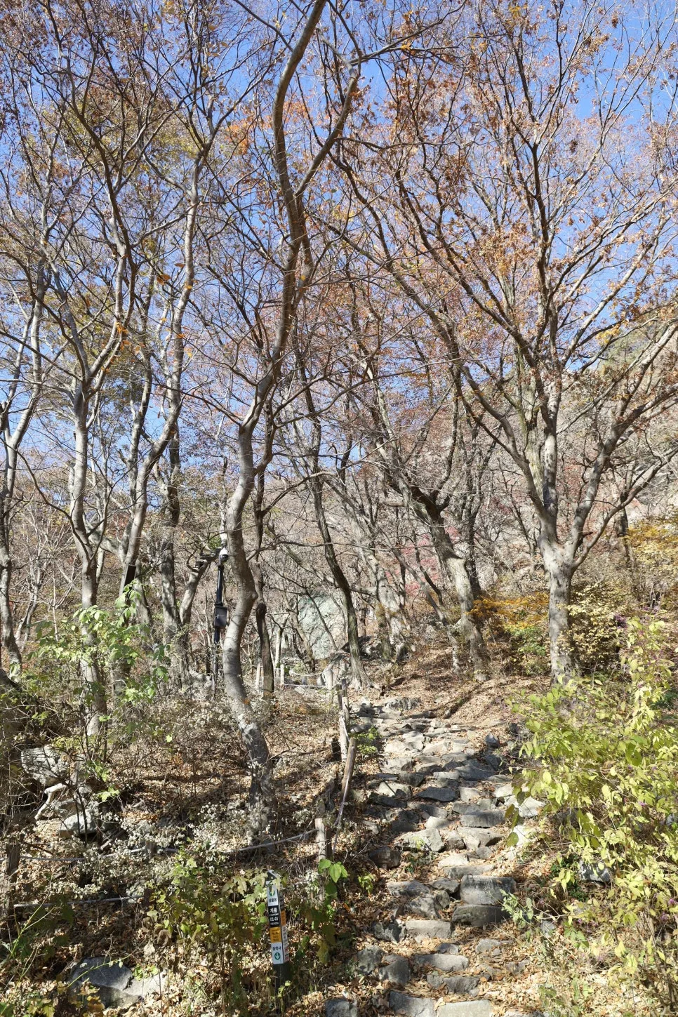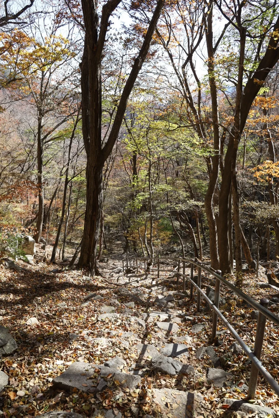 11월의 돌계단길은 쉬운 길이 아닙니다. 낙엽이 그 위에 쌓이기 때문이죠. 낙엽을 잘못 밟으면 미끄러지기 쉽거든요. 게다가 불규칙적으로 만들어진 돌계단은 발을 어디에 디뎌야 할지 알 수 없어서 잔뜩 긴장을 하게 됩니다. 스틱도 자꾸 미끄러져서 소용없게 되구요.