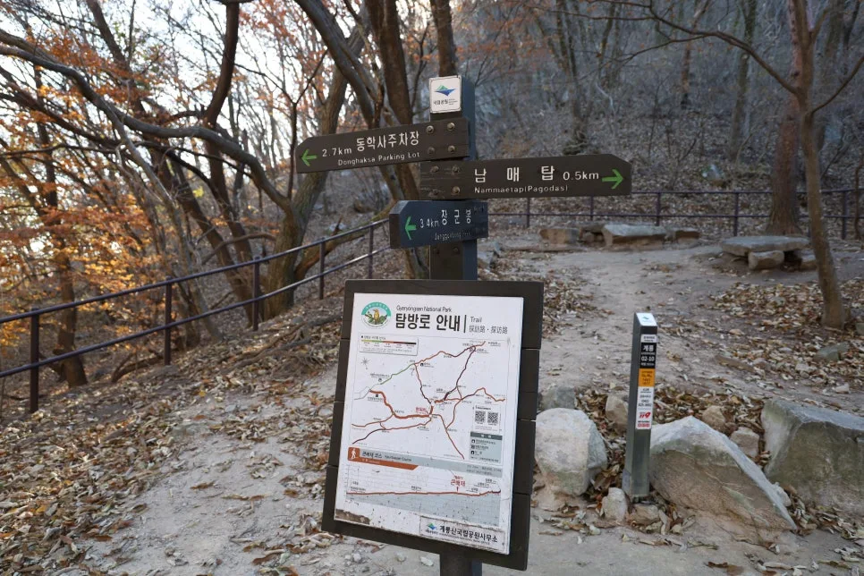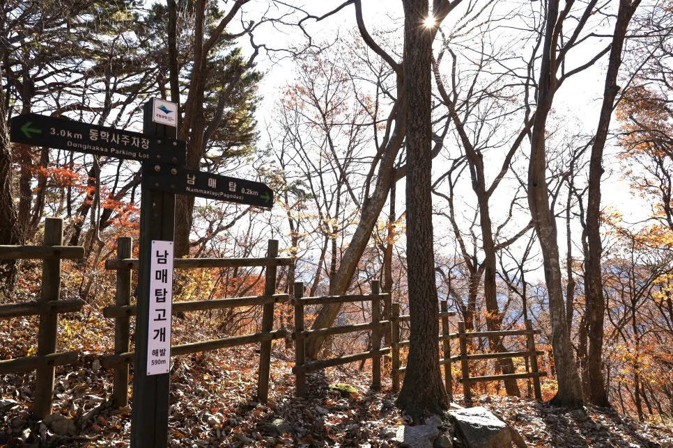 다음날 드디어 그때 못한 산행 코스인 동학사주차장~문골삼거리~큰배재~남매탑 ~삼불봉~동학사로 내려왔어요.