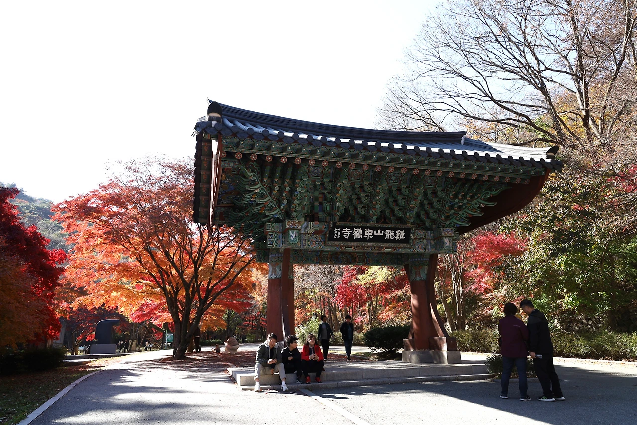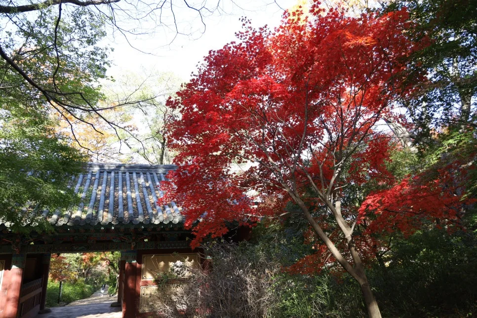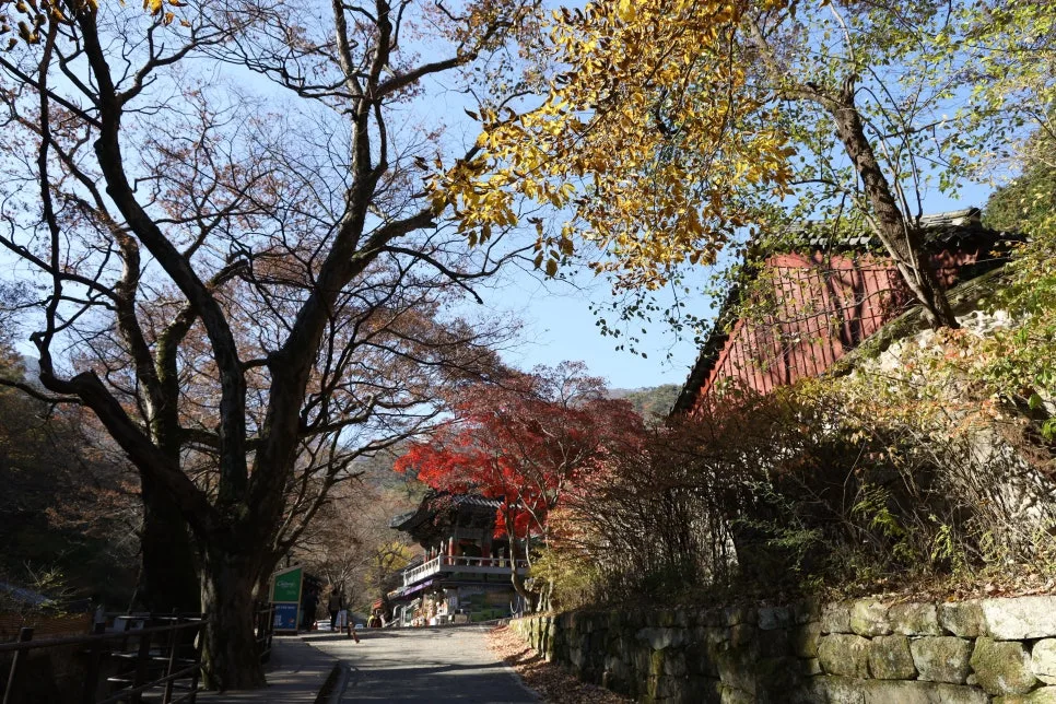 단풍 절정이 지나서 온 줄 알고 일주일만 더 빨리 올 걸 하고 서운해했더니 동학교를 지나 일주문이 가까워지자 온통 빨갛게 물든 단풍으로 불난 듯합니다.