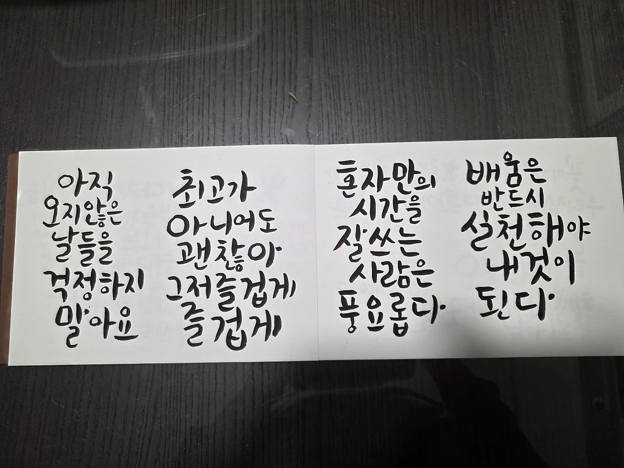 캘리그라피로 작가가 되거나 부업을 하고 싶은 생각도 없으니 이것도 자격증 딸 정도로 애쓸 필요가 없다. 그저 내가 즐겁고 마음 맞는 사람들과 좋은 시간을 함께 하는데 만족한다.