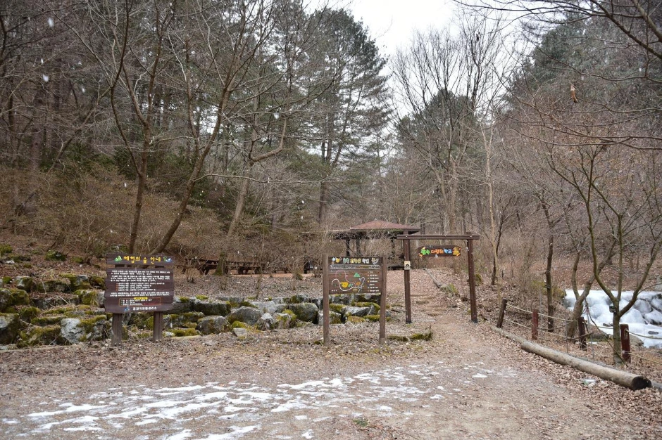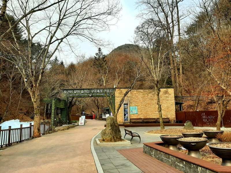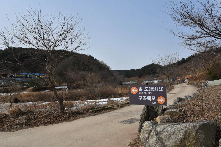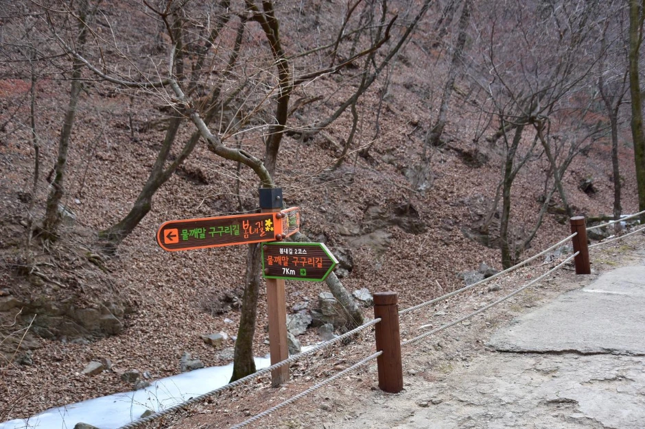 강원도는 늘 여행지였다. 고향은 남쪽 지방이고 서울에 산 지는 40년이 넘었다. 아는 친척도 없고, 가까운 친구도 없었으니 예전의 강원도는 멀기만 한 곳이었다. 어느 날부터인가 여행에 맛을 들여 주말마다 유명 관광지를 찾아다녔다. 수순이랄까 우연히 등산을 시작한 것이 이제는 매주 산행으로 바뀌었고, 직장을 퇴직하고 나서는 산행기나 걷기길 여행기를 블로그에 올리는 취미 생활로 발전하는 동안 산이 많고 좋은 걷기길이 있는 강원도는 시나브로 나와 가까워졌다. 고속도로가 뚫리고, KTX까지 연결된 것도 한몫한 셈이다. 이제는 강원도 가자고 하면 부담 없이 따라나선다. 구곡폭포는 데이트 시절 겨울에 한 번 와 본 적이 있었다. 그때는 폭포 가까이까지 갈 수 있었던 것으로 기억하는데, 가는 길이 얼음길이라 입구에서 아이젠을 구입했던 기억이 난다. 겨울 구곡폭포는 빙벽 타기의 명소였던 모양으로 자일을 타고 빙벽을 오르던 사람들을 보고 신기하게 생각하였다. 남편이 겨울 구곡폭포에 가자고 했을 때 빙벽 타는 사림들을 구경할 수 있을 줄 알았는데, 안전 문제로 금지하고 있어서 볼 수 없었다. 제주에 올레길이 있듯이 춘천에는 봄내길이 있다. 4코스인 의암호 나들길에는 예전에 다녀온 적이 있는데, 모두 8코스까지 있다고 한다. 이번 구곡폭포와 연계된 봄내길은 2코스 물깨말 구구리길이다. 물깨말은 강촌의 우리말 이름인데 물가에 있는 마을이라는 뜻이란다. 구구리길은 아홉 구비로 돌아 흐르는 구곡폭포와 관련이 있는 모양이다. 물깨말 구구리길. 참 다정한 우리말이다. 구곡폭포는 춘천시 남산면 강촌에 있었다. 입구에서 구곡폭포까지는 약 20분 정도 걸으면 된다. 넓은 포장도로라 길이 편했다.