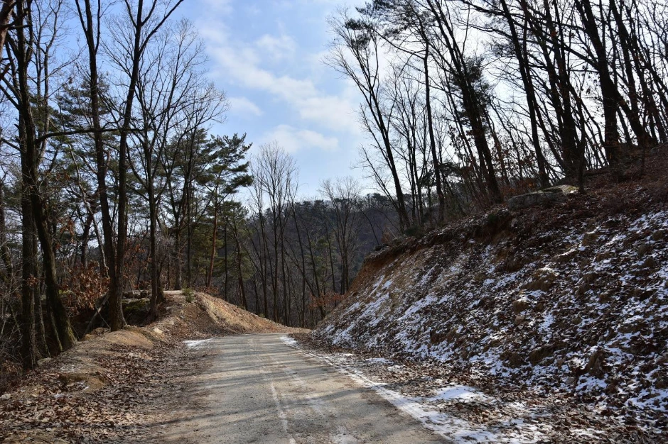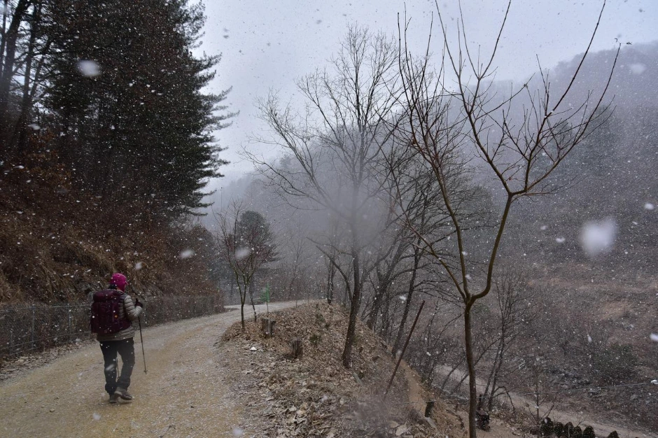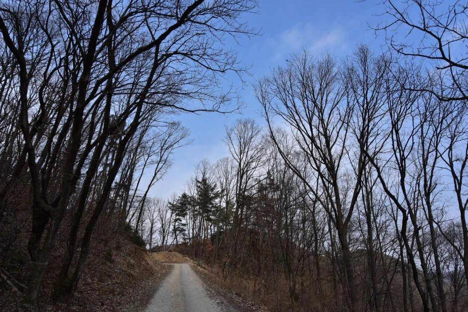 마을 길을 지나 또 고개를 하나 넘으면 약 5km 정도의 임도가 구곡폭포 입구까지 연결된다. 구곡폭포에서 깔딱고개로 넘어오면 30분도 안 걸리는 거리가 우리 걸음으로 2시간 반이 넘게 걸리는 거리가 되는 것이니 그 고개가 힘은 좀 들어도 얼마나 소중한 곳일지 짐작이 간다. 요즘은 시골도 집집마다 차 없는 집이 거의 없다는데, 문배 마을에도 주차된 자동차를 꽤 보았고, 길에서 지나가는 자동차를 만나기도 했다. 다행인 일이다. 이제는 무거운 짐을 지고 깔덕 고개를 오르내릴 일은 없겠지.
