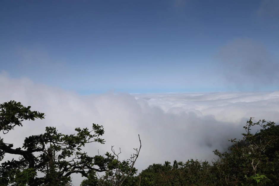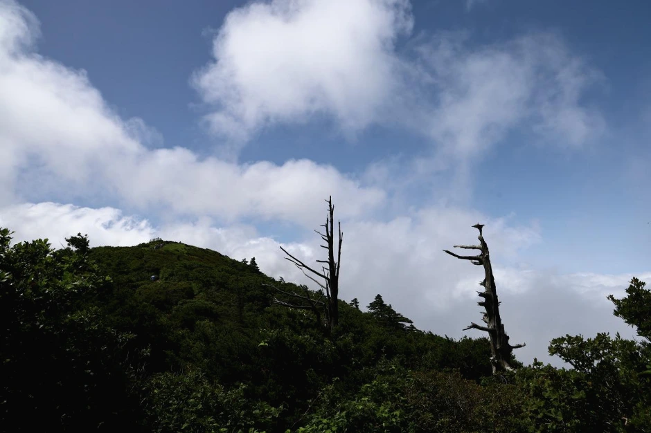 향적봉 쪽을 바라보니, 서쪽에 있는 구름이 덕유산을 넘지 못하는 모습이다. 동쪽은 두터운 층이 낮게 깔려 있으나, 구름 위쪽은 파란 하늘이 드러나 있는데, 서쪽의 구름이 밀고 들어오지 못하는 바람에 색다른 풍경이 만들어진다.
