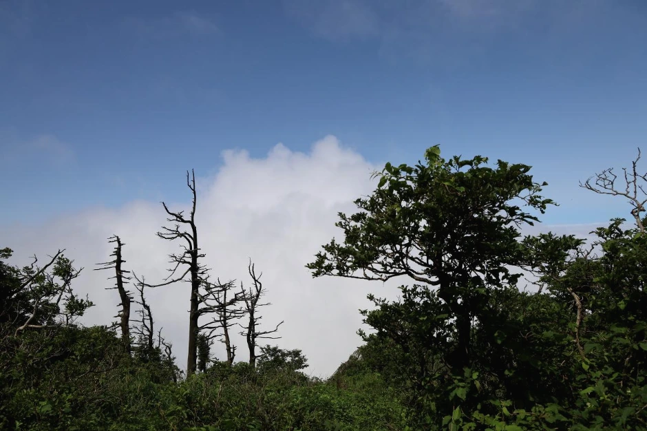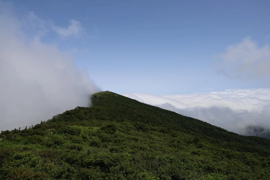 중봉에 올라서서 송계삼거리쪽 평전을 바라보니, 멋진 구름의 항연이 펼쳐지고 있다. 봉우리보다 조금 낮은 편이라 틈새를 엿보는 듯 구름이 야금야금 산 허리를 감아 들어오고 있는 모습이 장관이다.