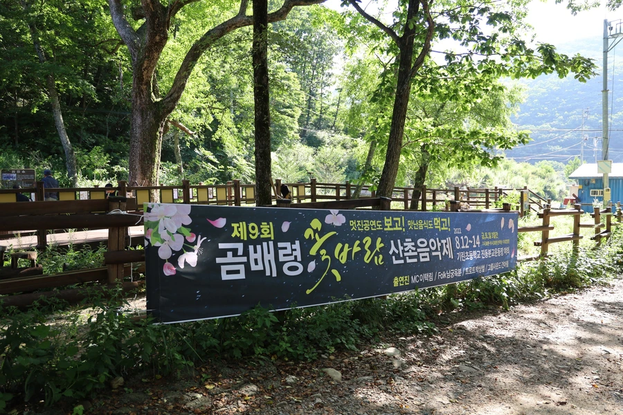 입구 쉼터에 곰배령 꽃바람 산촌 음악제를 알리는 플래카드가 붙었다.