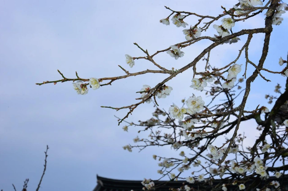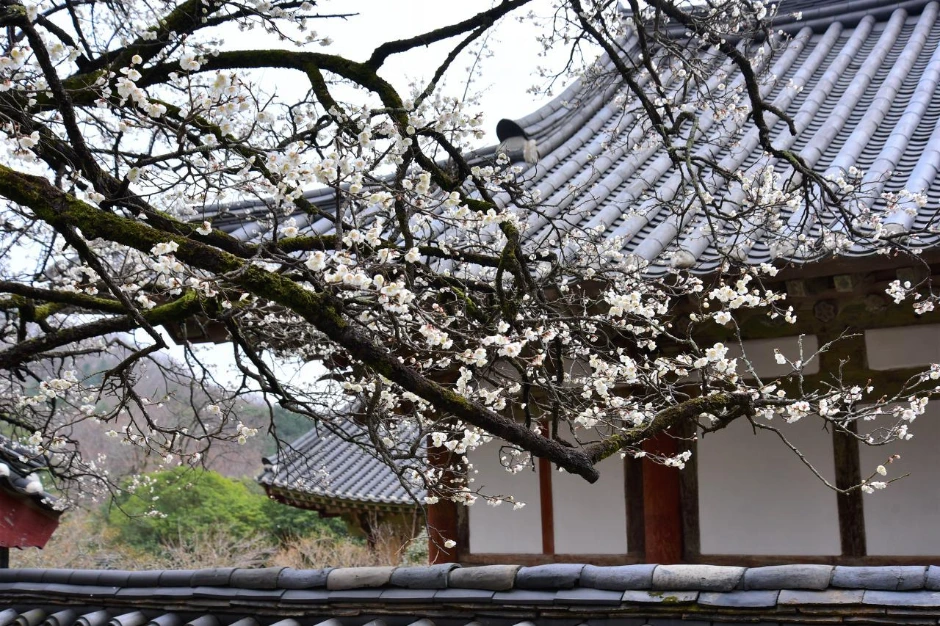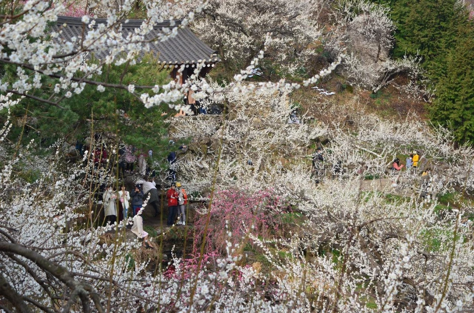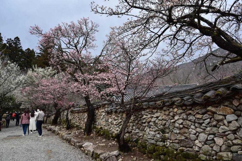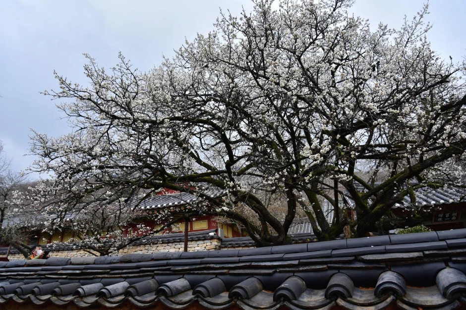 절 마당에 들어서니 매화 한 그루가 먼저 활짝 핀 채 우리를 맞이한다. 각황전으로 가 보니 입구의 홍매화는 이제 시작인가 보다. 빛깔이 옅은 편이다. 담장 옆의 분홍색 매화들은 그래도 활짝 피어서 다행이었다. 담장 뒤편에는 백매화가 많이 피었다. 사람들이 너무 많아 멀리서 한 컷 찍어보았다.
