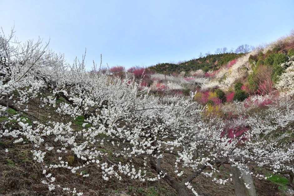 산 위에 올라가면 청매실 농원이 하얀 매화 속에 파묻힌 것처럼 보인다. 마치 눈 온 것처럼. 올해는 색이 좀 다르다. 2년 동안 못 본 사이에 확실히 컬러풀해졌다.