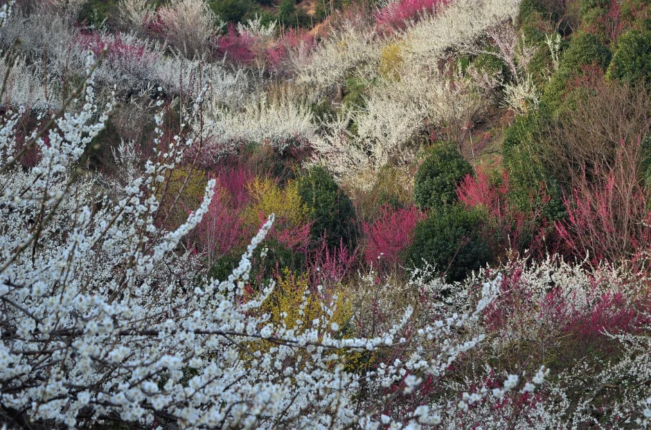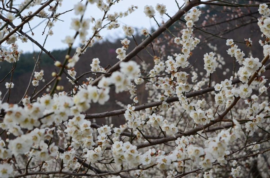 사실은 매화 꽃 색깔이 백색만 있는 건 아니다. 연한 분홍도 있고, 홍매화는 이름처럼 붉은 빛이다. 거기에 우리나라 토종 식물 히어리와, 군데군데 심어놓은 생강나무와, 산수유 몇 그루의 연한 노랑이 합쳐져 한 쪽편 산을 화려하게 물들여 놓았다.
