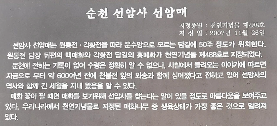 선암사 매화는 특별히 선암매라는 이름이 붙어있는데, 우리나라 천연기념물 제 488호로 지정되어있다고 한다. 바로 각황전 옆에 있는 홍매화와 원통전 뒤편의 백매화인데, 원통전 뒤의 선암매(백매화)는 만개 수준이었다.