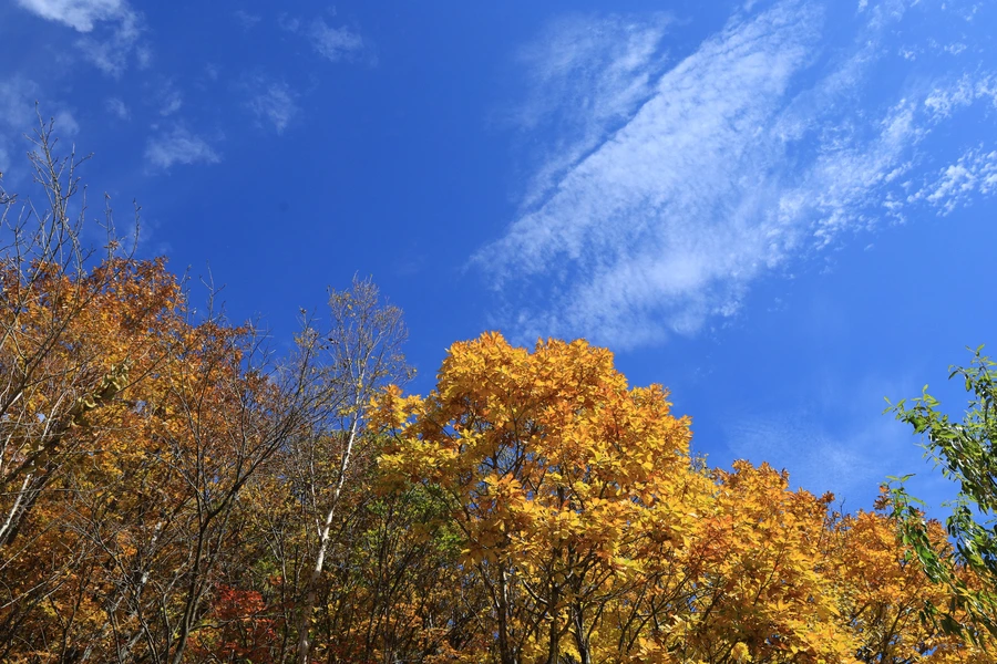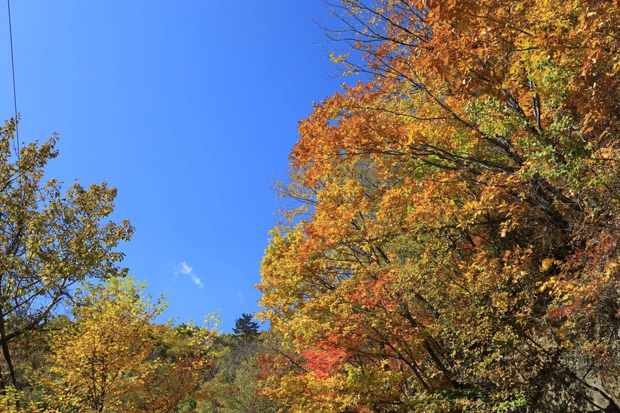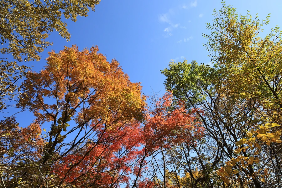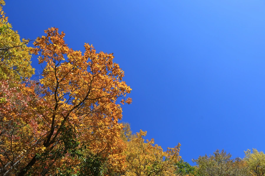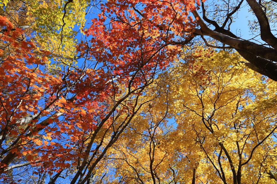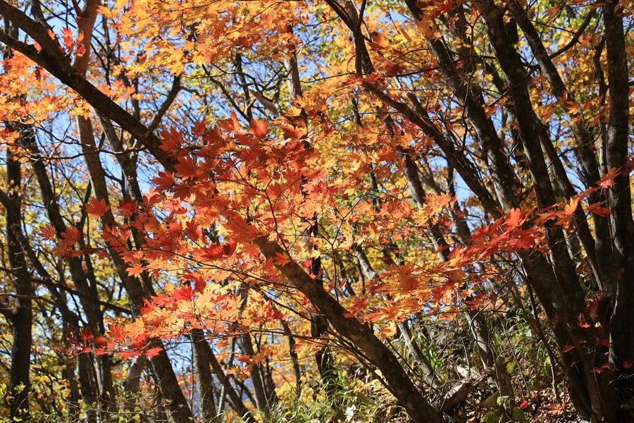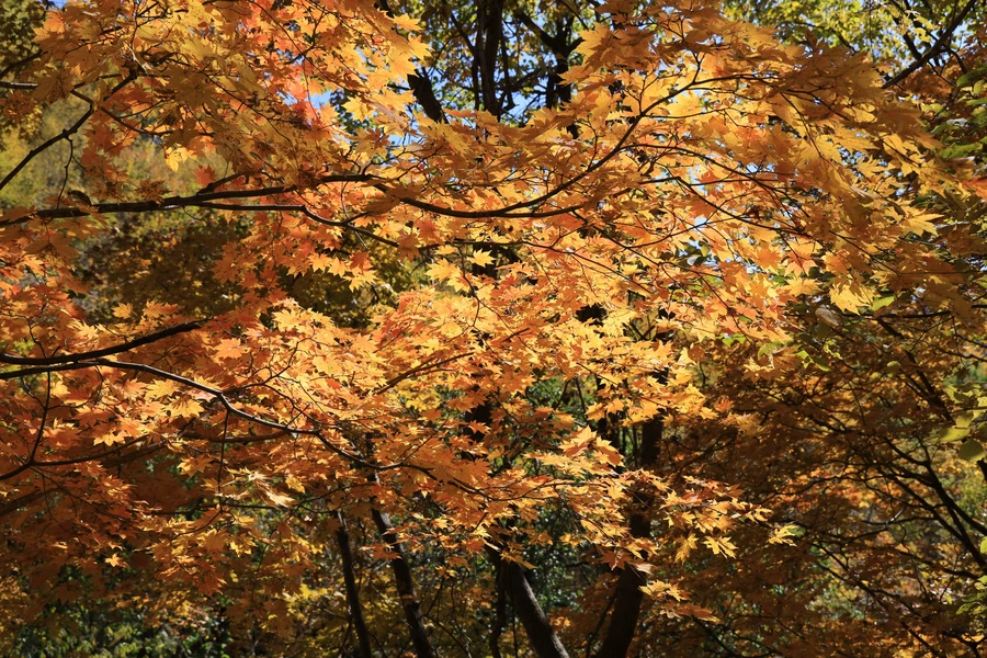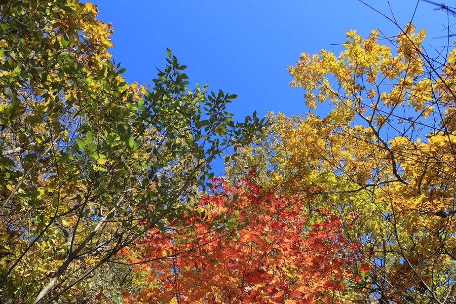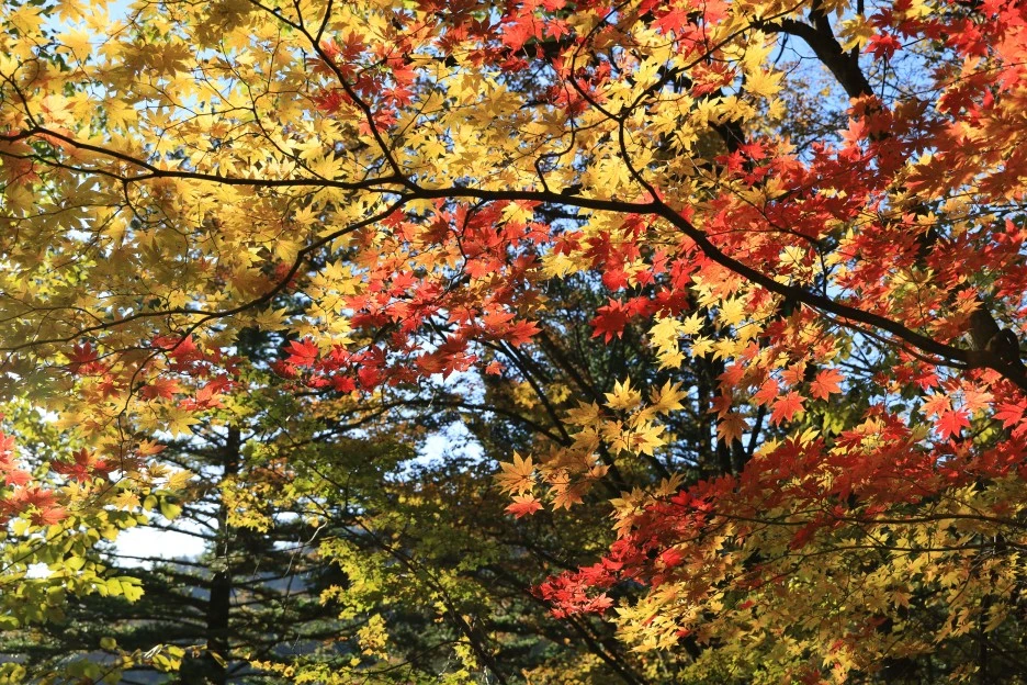 산에서의 단풍나무 잎은 빨강, 주황, 노랑, 혹은 그 혼합색 등 다양한 색으로 물이 듭니다.