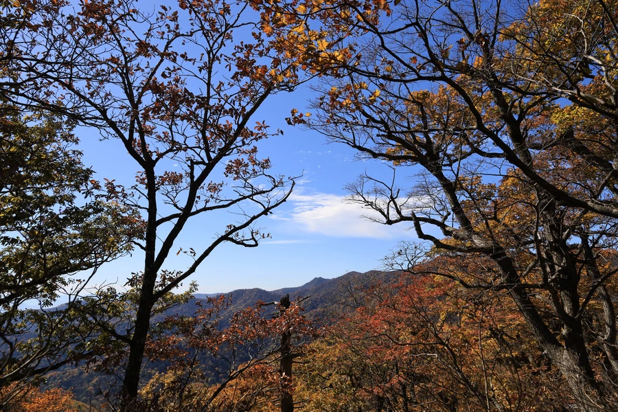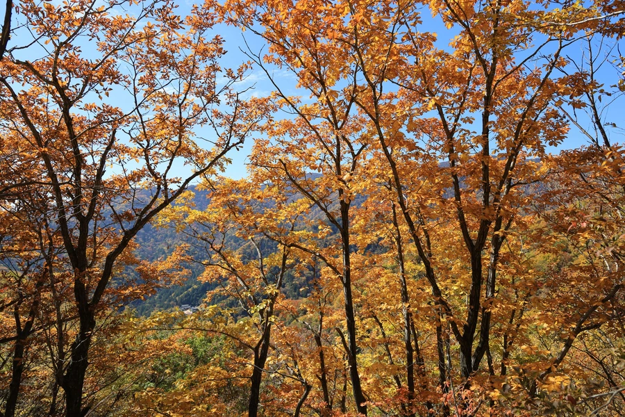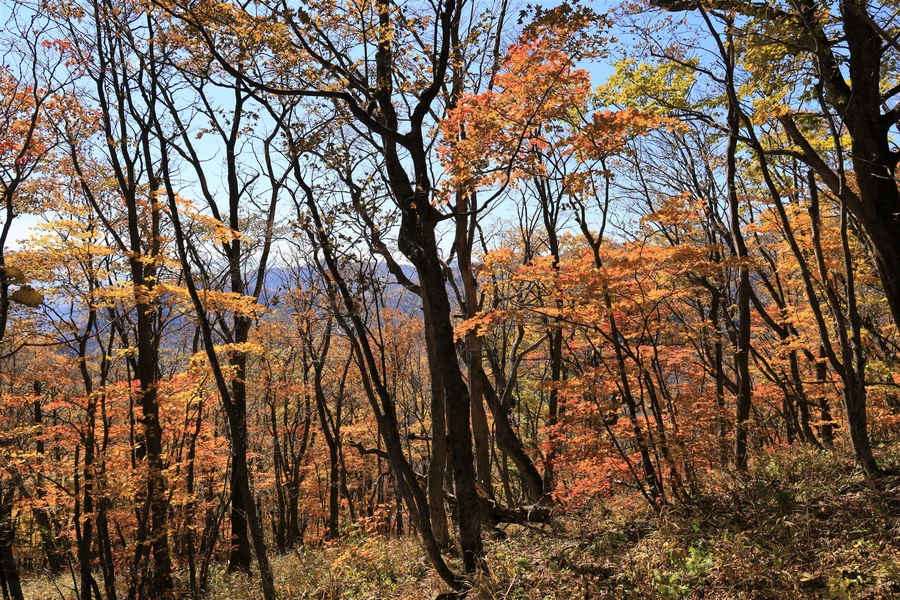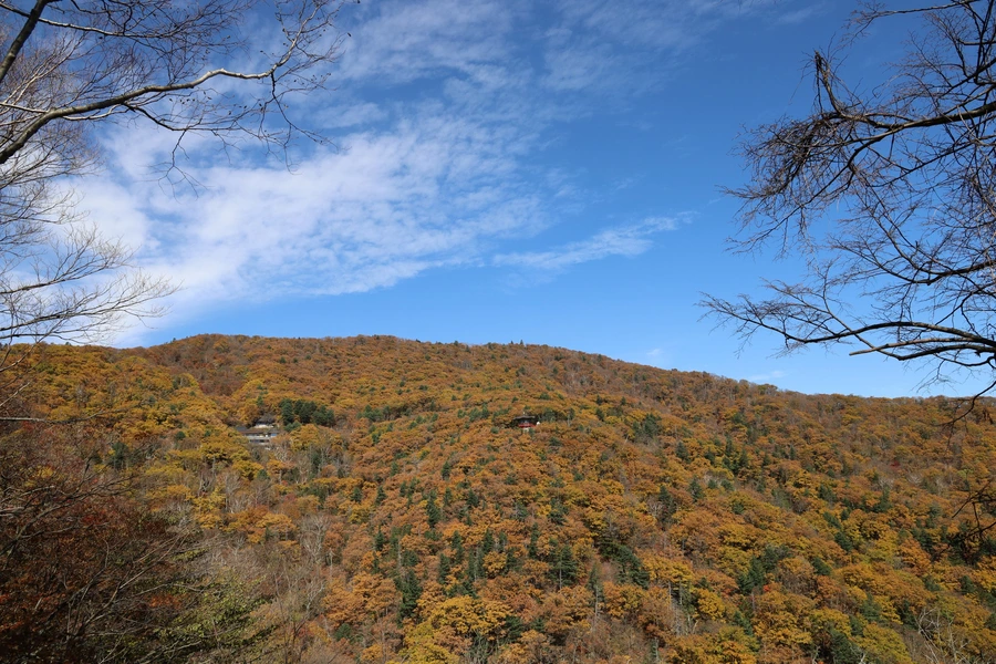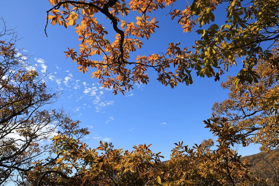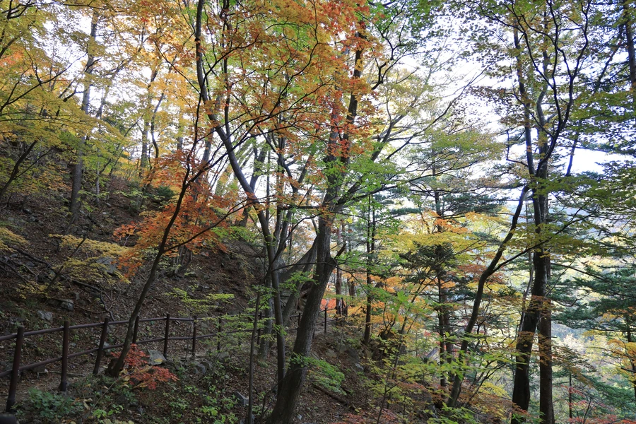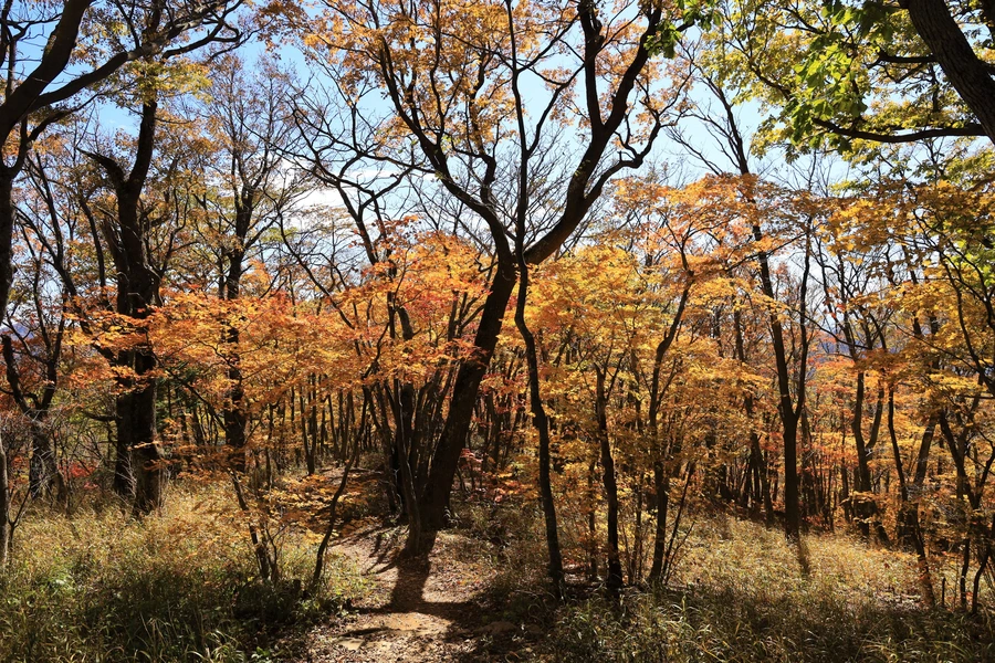 산은 단풍이 절정입니다. 참나무가 많은지 멋진 주황색 단풍색이 아침 햇빛을 받아 제대로 빛나네요.
