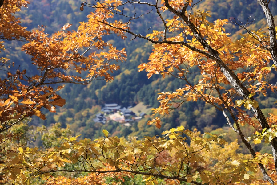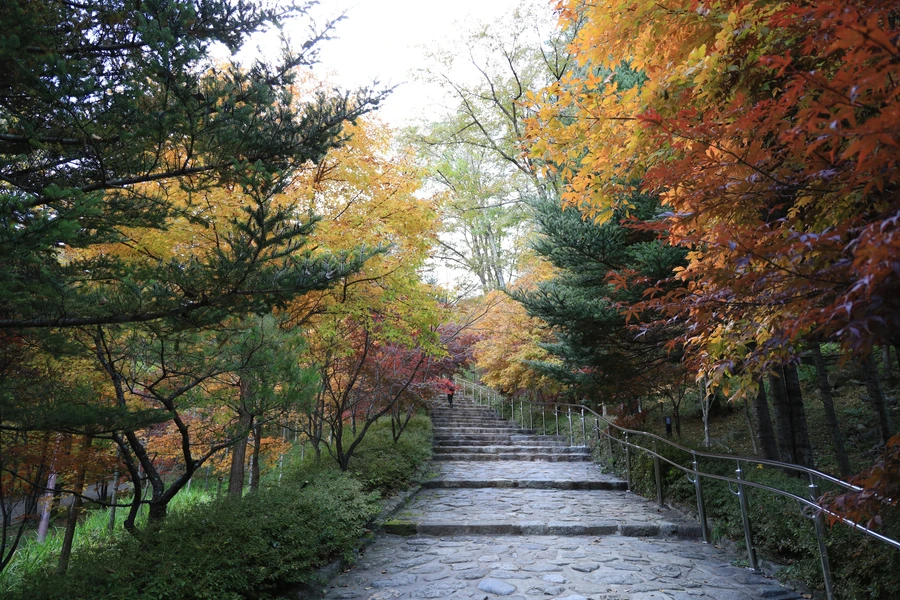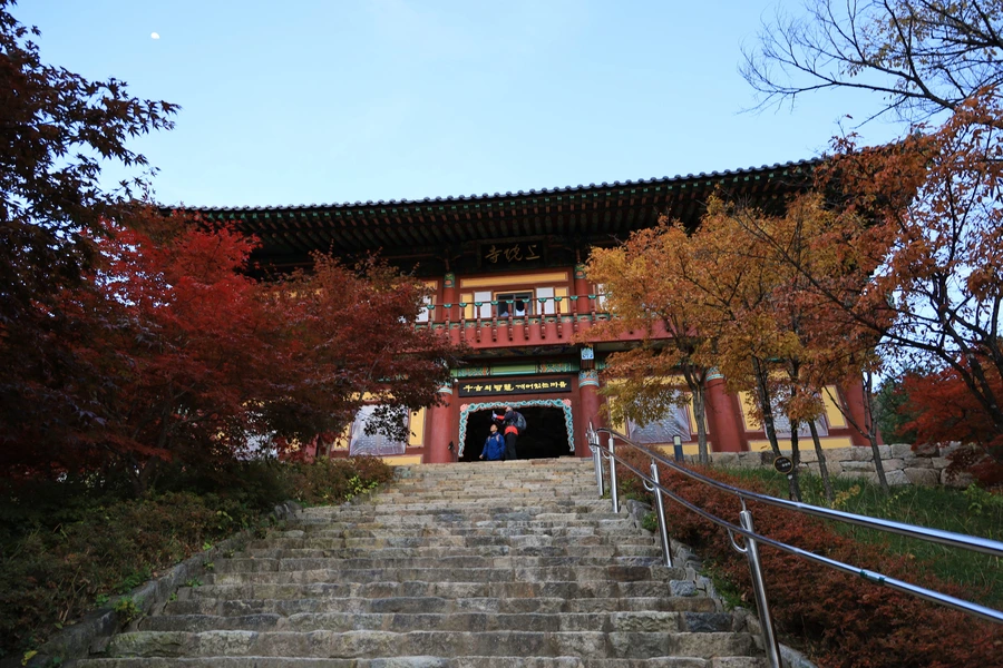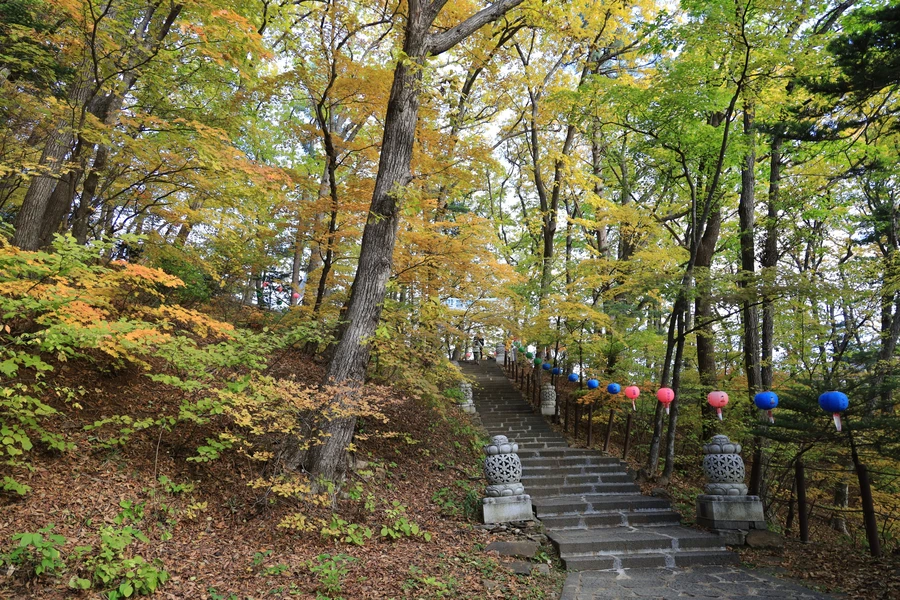 저멀리 북대사 모습이 주황색 단풍산 속에 파묻혀 있네요.