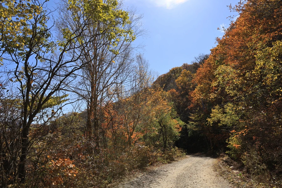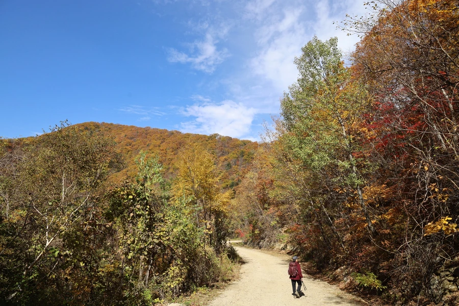 임도는 편안한 길이라 부담이 적지요. 곳곳에 심심찮게 단풍이 아름다운 풍경을 만들어주어 지루할 새가 없네요.