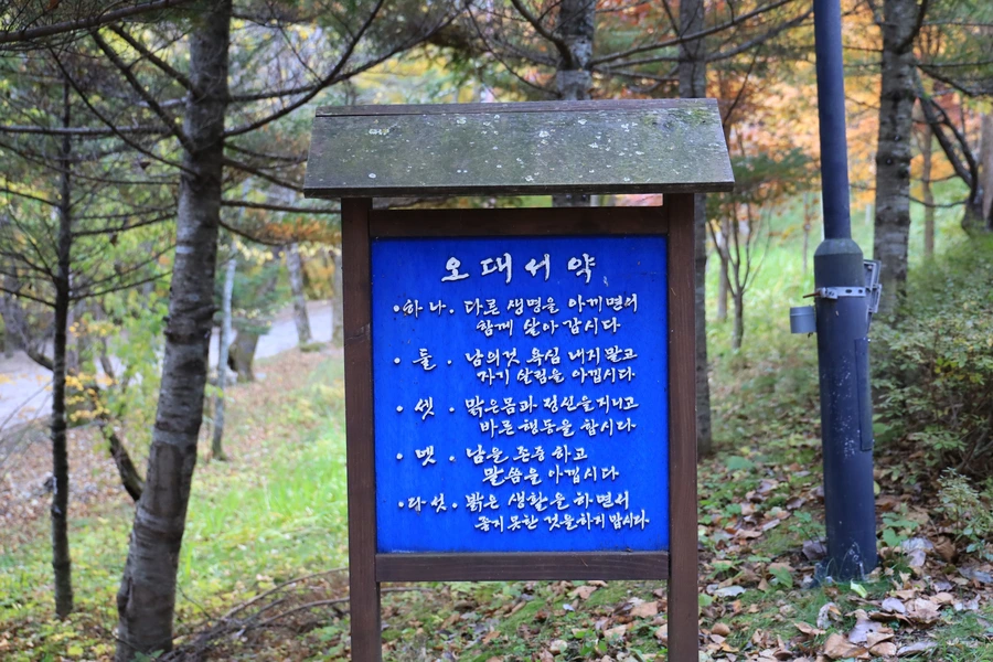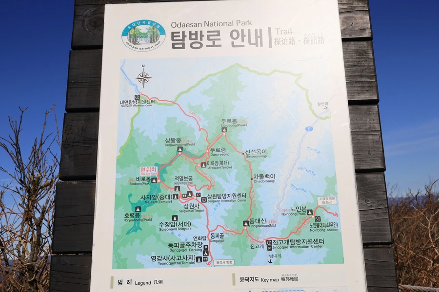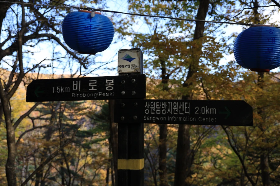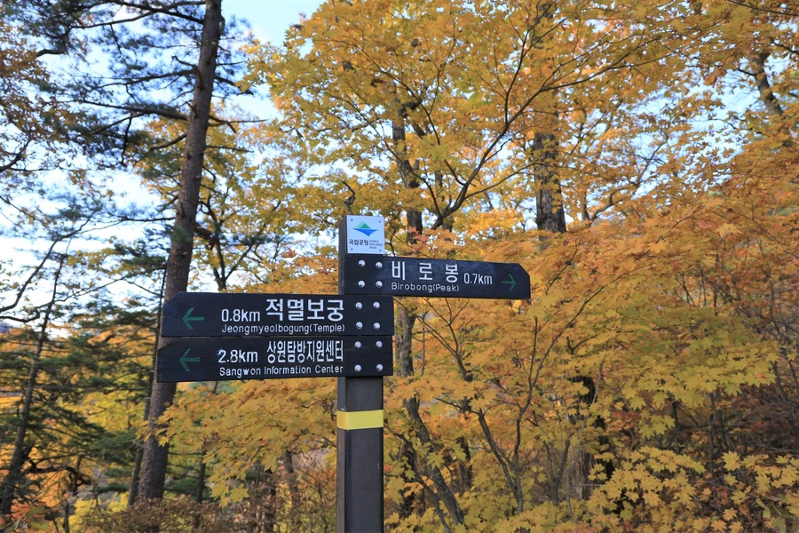 오대산 비로봉 등산로는 상원사 - 적멸보궁 - 비로봉(정상) - 원점회귀하는 짧은 코스와, 비로봉에서 상왕봉 - 두로령 - 북대사 - (임도) - 상원사 주차장으로 내려오는 긴 코스가 있는데, 우리는 비로봉에서 상왕봉으로간 다음, 두로령으로 가지 않고 상왕봉 삼거리에서 임도로 내려와 상원사 주차장으로 내려오기로 했습니다. 오는 길에 보니까 선재길 단풍이 예뻐서 잠깐이라도 걸어보려고 했던 거죠.