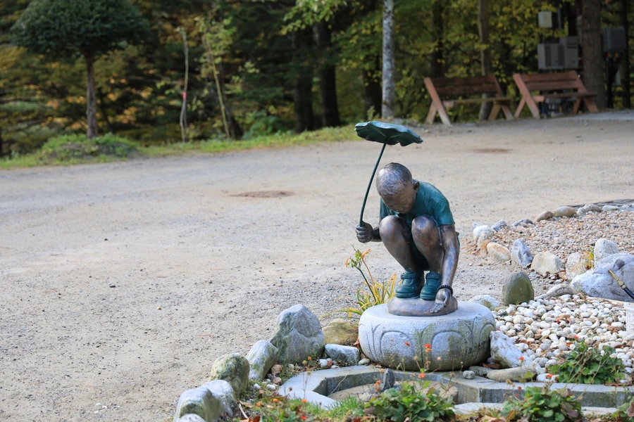 남편이 이 소년상을 찍고 싶었던가 봅니다. 연잎을 우산처럼 쓰고 있는 아이는 아직 동자승도 아닌 모양입니다. 평상복 차림의 아이는 작은 연못 옆에서 앞으로 동자승으로 살아갈 생활을 상상하는 걸까요? 지금껏 살아온 세상을 그리워하는 걸까요?