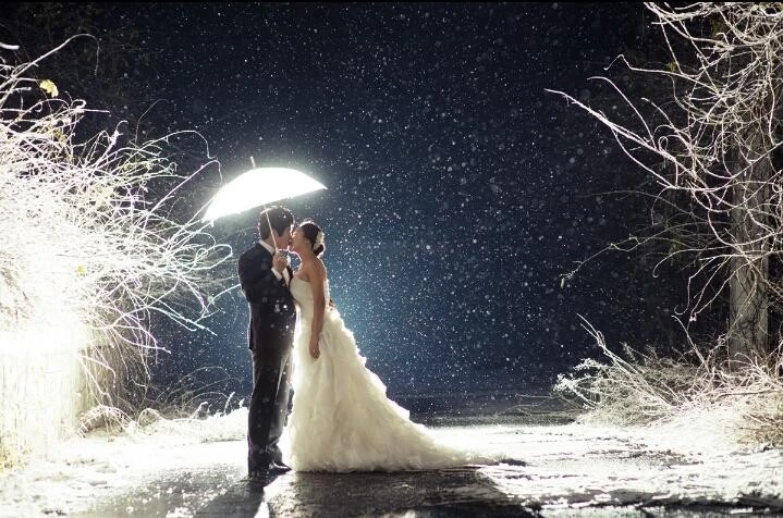 눈이 내리를 날 야외에서 조명을 이용해서 눈을 표현한 특별한 웨딩사진