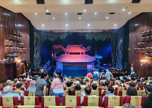 계단을 내려와야 그 계단을 통해 다시 다음 공연 관객들이 입장할 수 있는 구조였다.여기도 내려오는 인파, 들어가려는 인파가 상당했다. 계단이 넓지 않아 그렇게 보였다.우리를 마중 나온 수상인형극장 관계자는 티켓 없이 우리를 로비와 객석으로 인도했고 참 좋은 객석을 준비해 줬다. 뚜안에게 고마웠고, 극장 관계자에게도 감사했다.