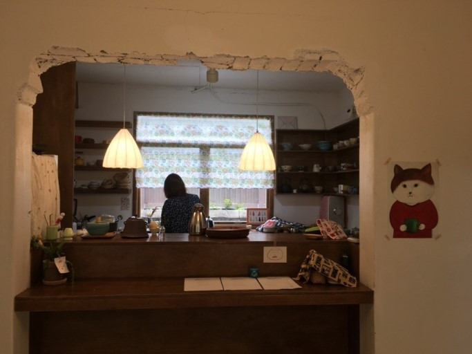 약간 어두운 실내에 비쳐 드는 흰 빛이 아늑하게 느껴진다. 선반에 아기자기 정리된 다기들이 예쁘다.