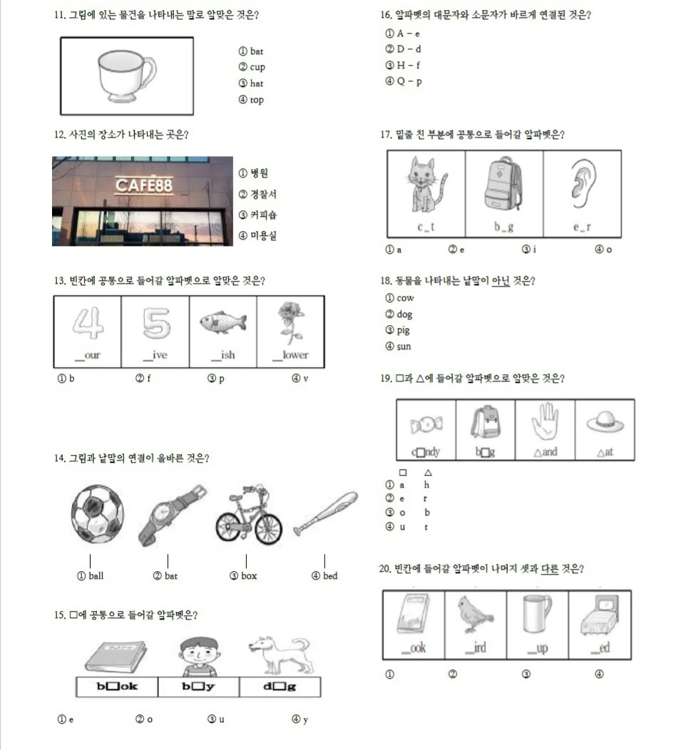 초등반 영어선생님들이 만든 문제들이다. 불과 4개월밖에 영어를 배우지 않아서, 알파벳을 겨우 쓸 수 있을 정도라고 생각했다. 예상과 달리 알파벳은 기본이고 제법 실용적인 영어 단어들이 문제로 등장했다. 학생들 중 서너 명은 처음에 비해 상당히 많이 늘었다고 귀띔해 주셨다. 이번 자체 평가에서 100점을 맡으신 분도 계셨고, 모두가 50점 이상을 받았다. 공부를 해도 늘지 않는다고 절망하시지만, 사실은 조금씩 지식이 쌓이고 있다. 본인들은 알고 있을까.