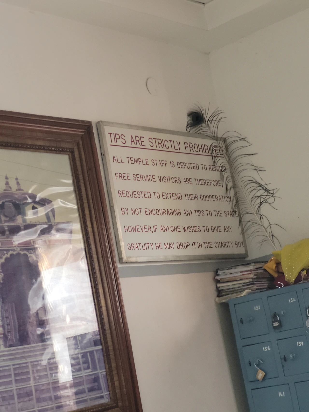 한 시간쯤 사원을 둘러보고 다시 외국인 응접실로 갔다. 입장할 때 날 맞이했던 직원이 나에게 잘 보았냐고 물어보았다. 그러면서 '사원에서는 사진촬영이 안되지만, 사원에서 운영하는 카페에서는 사진을 찍으실 수 있답니다. 혹시 관람에 만족했으면 팁을 주시는 게 어떨까요?'라고 나에게 정중히 청했다. 팁은 미처 생각지 못했지만, 입장료가 무료였고 어느 정도 그녀의 서비스에 만족했기에 100루피를 건넸다.(원화 1600원) 그녀는 'Thank you.' 한마디를 남기고 퇴장했다. 그리고 그녀가 퇴장하자마자, 그녀 뒤에 있던 충격적인 경고문이 내 눈에 들어오고야 말았다.