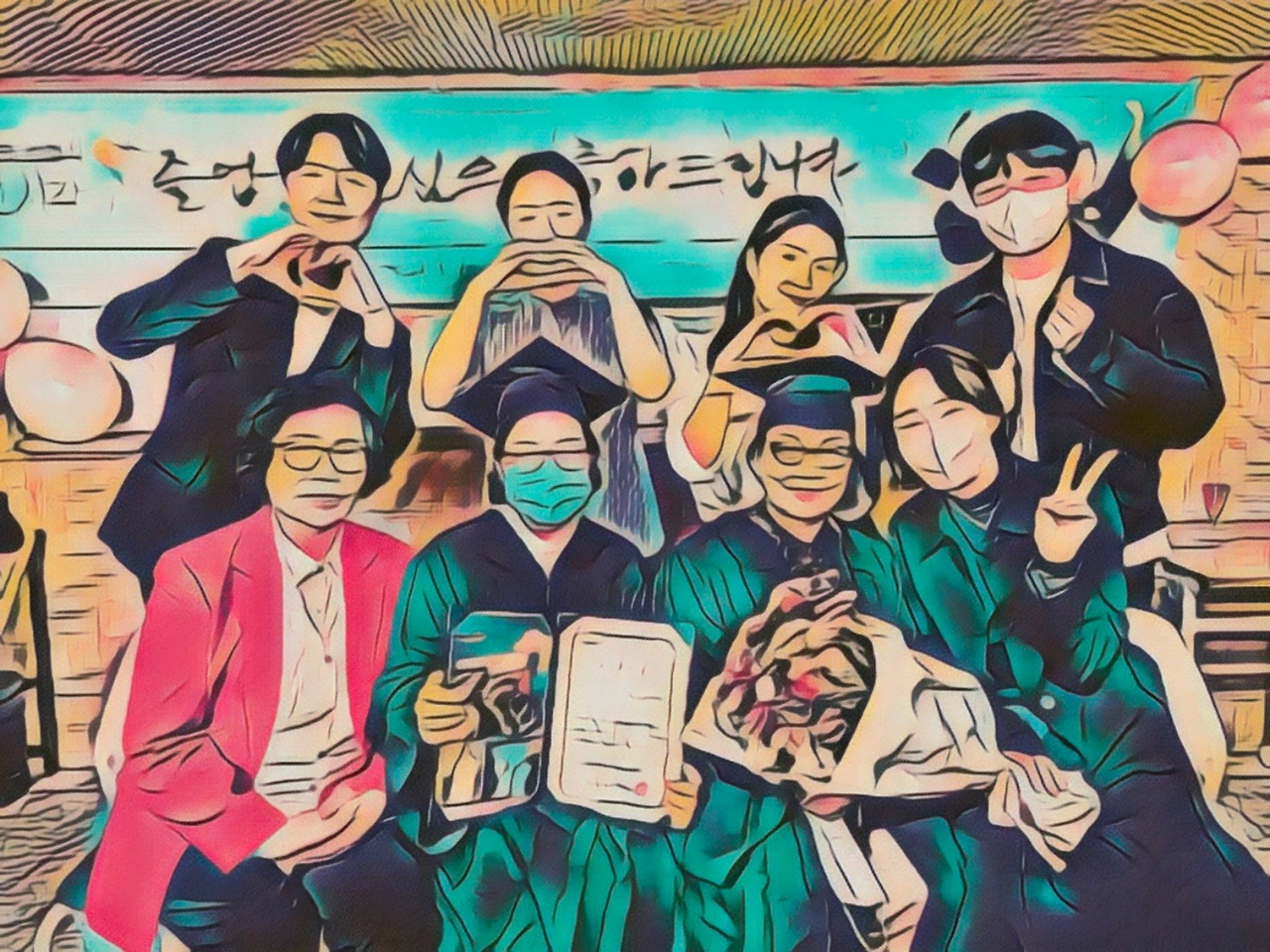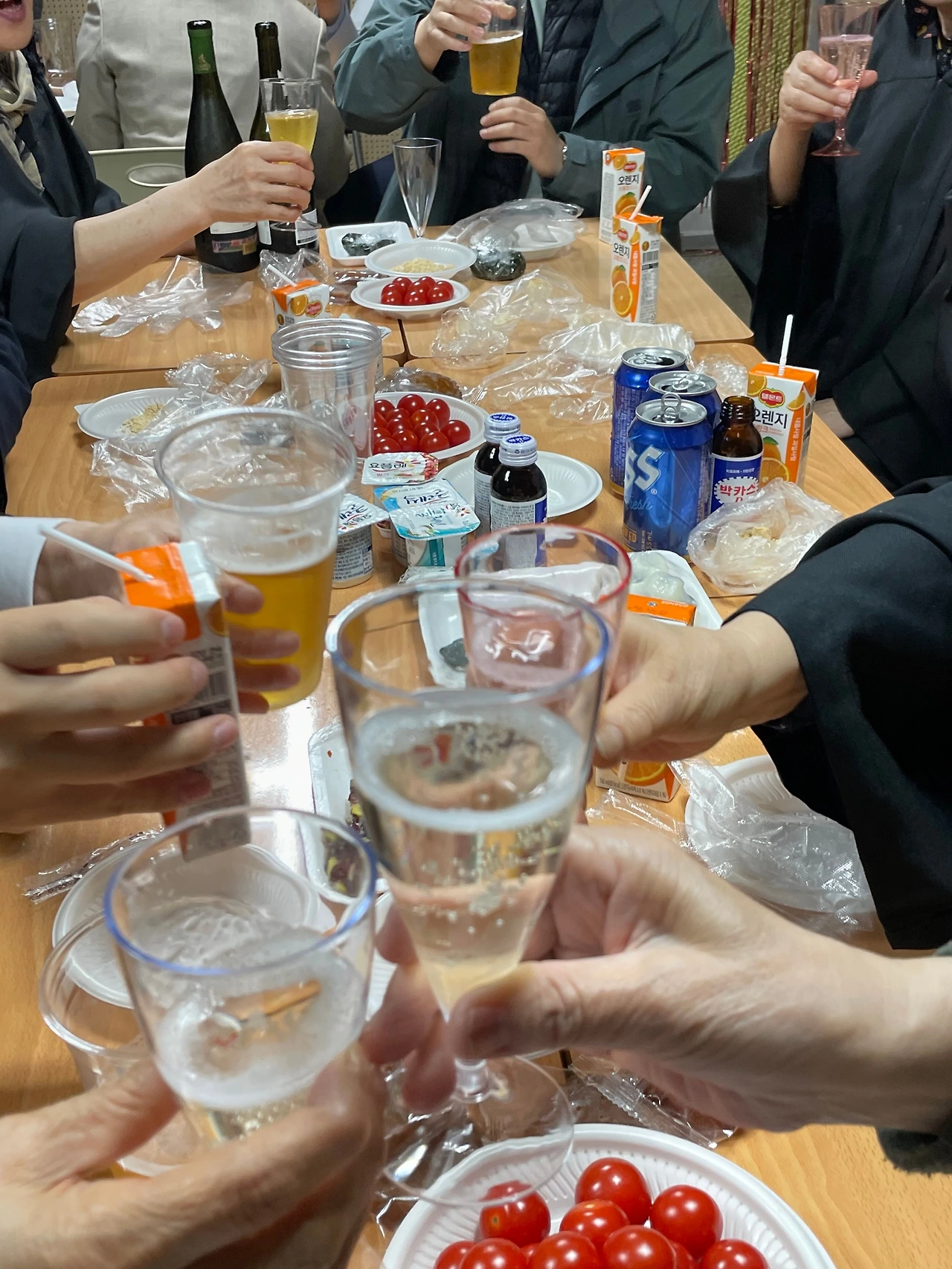 나는 즐거운 졸업식을 만들고 싶었다. 엄숙한 분위기를 그다지 좋아하지 않는다. 경건한 세리머니보다는 북적거리는 잔칫날이 되었으면 좋겠다. 그래서 책상에 다과, 떡, 술을 깔았다. 일부러 졸업식을 제시간보다 10분 늦게 시작했다. 그사이 학생들과 선생님들이 이야기를 주고받고, 다과는 긴장을 풀어주길 바랐다. 나의 기대와 다르게 미순 씨는 다과를 쳐다만 볼 뿐, 손을 대지 않으셨다. 졸업가운이 어색하신가. 아니면 지금 이 상황이 낯선 걸까. 내 작전이 실패인가. 그 순간, B선생님이 다이소에서 산 개당 2000원짜리 샴페인잔을 두 손 가득 들고 나타났다. 그리곤 마치 역전 신문팔이처럼 이렇게 외치며 교실을 누빈다.