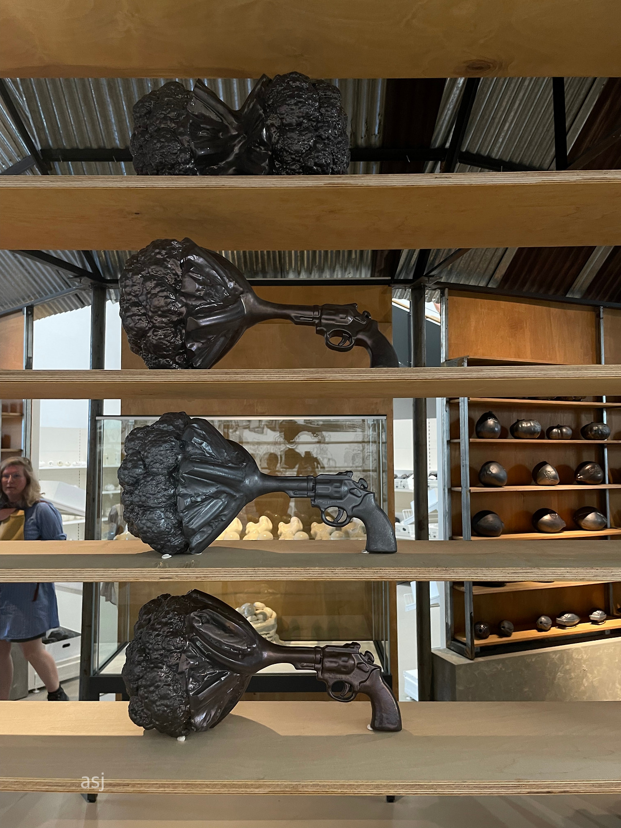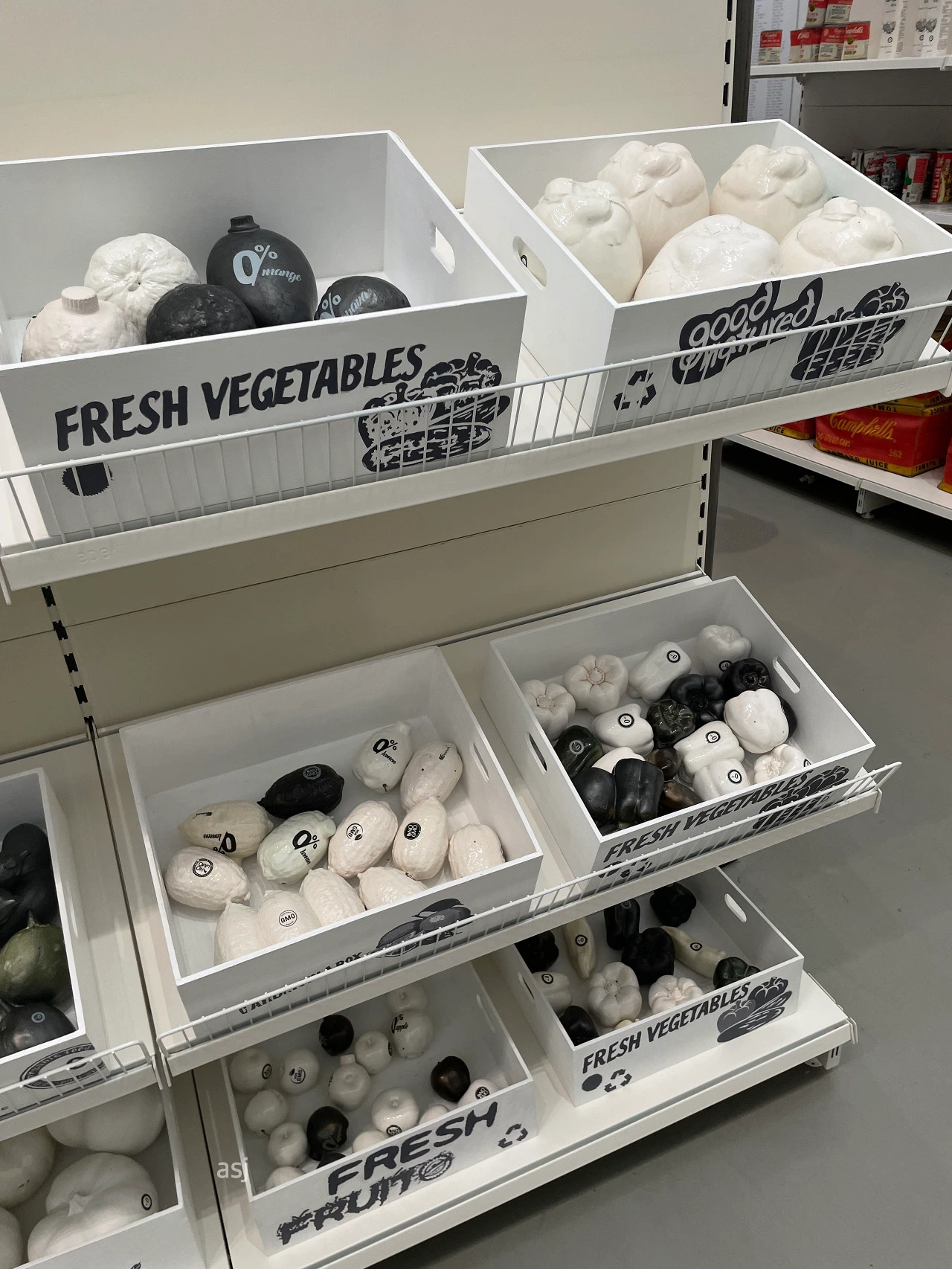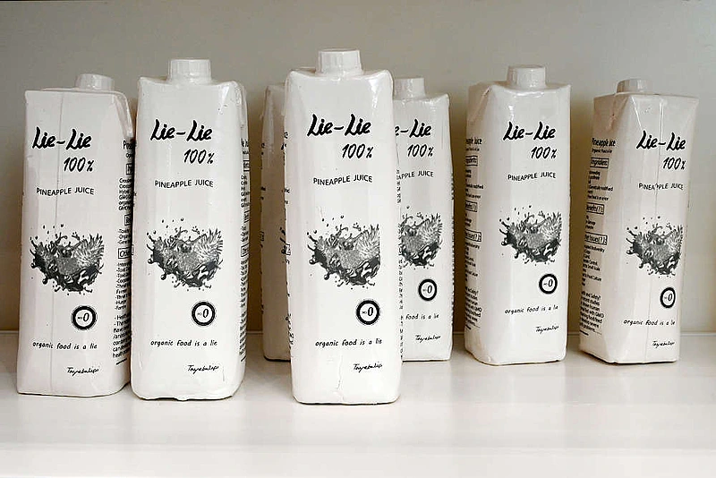 자세히 들여다보기 전까지는 이 세라믹으로 재현된 식재료들이 무엇을 의미하는지 알 수 없었다. 흑과 백으로만 구성된 식재료들은 차갑다 못해 죽어있는 이 세상의 것이 아닌 인상을 주었고 곧바로 표면에 새겨져 있는 글자로 눈을 이끌었다. "0% 망고", "0% 구아바", "거짓말 100% 파인애플 주스" 등..