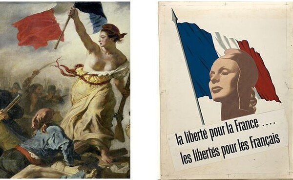 누워있는 인물의 옷의 색깔과 삼색기의 색깔이 일체감을 보여줌(좌) 프랑스를 위하 자유 포스터의 마리안느(우)
