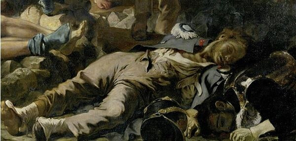 그림의 하단에는 쓰러진 군인 복장을 한 남성의 머리 옆에는 왕실군을 상징하는 화려한 철모가 놓여있다.