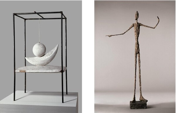 자코메티, 매달린 공(왼쪽, 1930), 포인팅 맨(오른쪽,1947)
