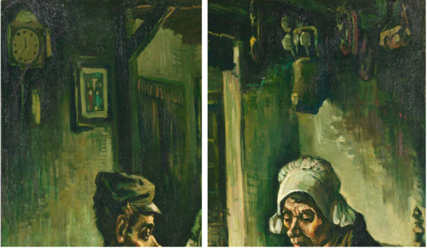 위의 그림에서 모자의 회색 속의 분홍색은 보색끼리의 양을 조절해 다른 색깔의 느낌으로 나타나게 했다. 이처럼 고흐는 색의 연구를 통해 그림 전반에 걸쳐 녹색과 진정한 감자색을 띤 인물들의 흙빛 얼굴을 표현했다.