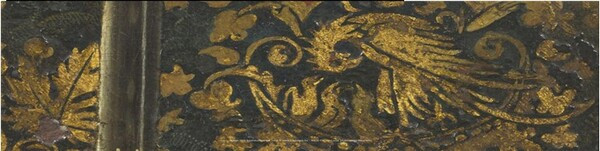 또 뒷면 벽지 같은 황금 비단에는 펠리컨과 포도나무가 있는데, 포도나무는 예수가 십자가에 못 박히실 때 흘린 피를 나타내는 상징이며, 펠리컨은 새끼에게 먹이를 주기 위해 부리로 자신을 희생하는 모습을 표현하고 있다. 이러한 모든 상징은 성경에 나타나는 여러 구절을 표현한 것이라고 할 수 있다.