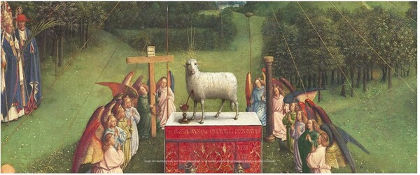 어린 양을 중심으로 좌우에는 천사들이 배치되어 있고, 어린 양은 인류를 죄에서 구원하기 위해 피를 흘린 예수를 상징한다.