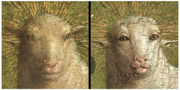 어린 양의 그림부분 복원전(좌) 덧칠을 벗겨내고 복원후(우)