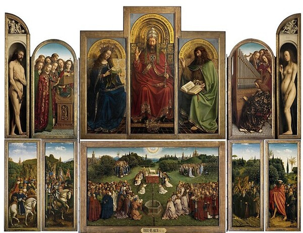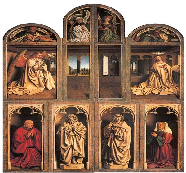 휴베르트 & 얀 반 에이크, 패널 위의 유채와 템페라,1420~1432, 5.2*3.75m(앞면)