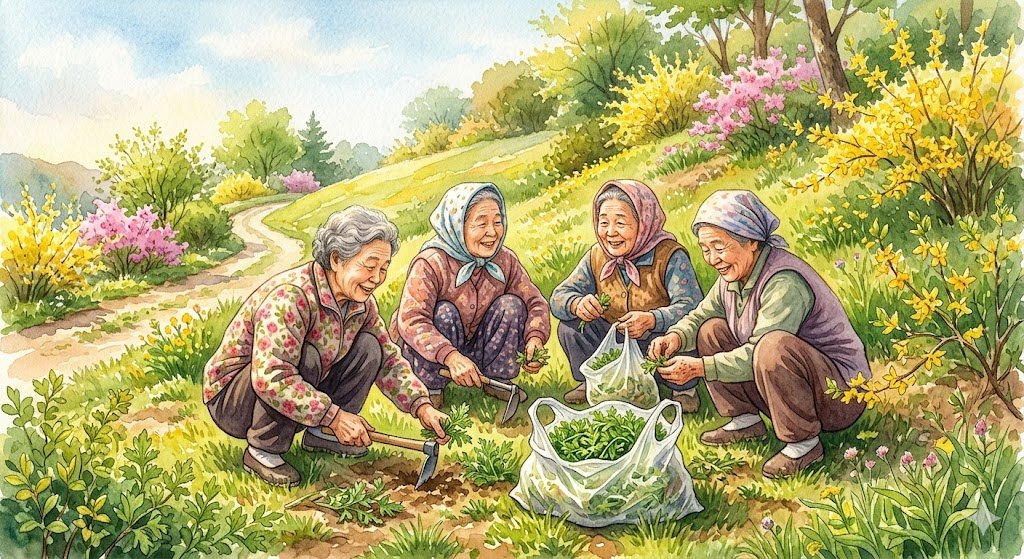 산책길 끝, 햇살이 오래 머무는 구릉에는 분홍 누비 조끼를 입고 머릿수건을 두른 할머니 네 분이 앉아 이야기를 나누고 있다. 가까이 다가가니 그 손끝에는 작은 봄이 들려 있다. 비닐봉지 속에는 어린 쑥과 냉이, 민들레, 씀바귀가 담겨 있다. 아직 손가락 반 마디밖에 자라지 않은 쑥은 진한 향이 올라왔고, 봉지는 봄기운으로 폭신하게 부풀어 있다.