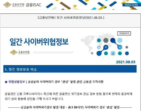 금융보안원 회원사라면 일간 사이버 위협정보를 메일링 받을 것이다. 해당 메일에는 일간 정보보호 이슈라던가 회원사들 대상으로 위협이 되었던 탐지/차단 시도 등의 정보를 압축해서 보내준다.