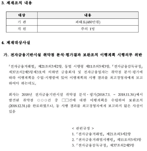 주로 관련부서가 IT·핀테크 전략국이나 디지털 금융 검사국인 경우 전자금융거래법이나 전자금융감독규정을 근거로 제재하고 중요정보는 비식별화하여 공개한다.