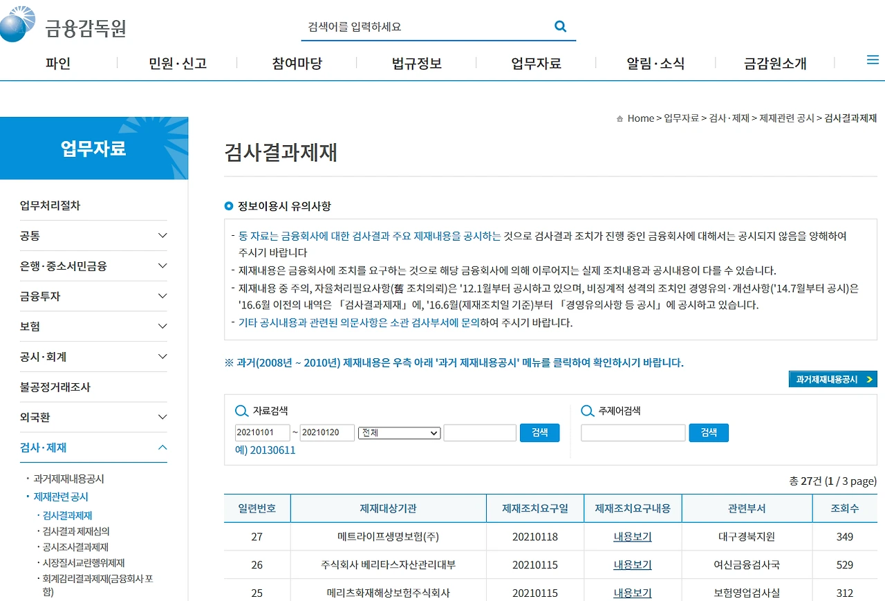 많은 금융회사들이 금융감독원에게 제재와 경영유의를 받는다. 어떤 금융회사가 검사를 받고 제재를 받았는지 금융감독원 사이트에서 공시하고 있다.