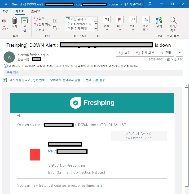 다 등록했다면 서비스 하나만 샘플로 내려보자. 타이밍 좋으면 아래와 같이 DOWN메일이 즉시 올 것이다. 타이밍이 안 좋아도 1-2분 이내로 온다. 여기까지 왔다면 거의 다 끝났다.