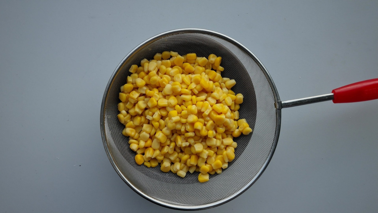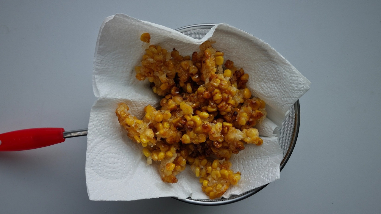 먼저 조심스레 통조림을 따고 물기를 빼기 위해 옥수수를 체에 밭쳤다. 남아있는 물기에 전분을 넣고 버무릴 것이기 때문에 완전히 물기를 뺄 필요는 없다. 전분을 크게 두 큰 술 넣고 잘 섞어주었다. 통조림옥수수는 이미 간이 되어 있기 때문에 따로 간을 더 할 필요는 없다. 적당한 크기의 프라이팬에 기름을 충분히 둘러주고 살짝 달궈주었다. 적당히 온도가 올라간 기름에 옥수수 한 알을 넣어봤을 때 치직하고 튀겨지는 소리가 나면 시간이 된 것이다. 옥수수 반죽을 모두 넣고 옥수수 사이사이를 살살 떼어가며 튀겨주었다. 이때 나는 왼손엔 나무수저를 오른손엔 나무젓가락을 들고 열심히 양손으로 튀겨주었다. 처음엔 전분이 젓가락에도 붙고 숟가락에도 붙고 했지만 금세 노릇하게 익어 붙지 않을 정도로 튀겨졌다. 그럼 체에 키친타월을 올리고 튀겨진 옥수수를 덜어 기름을 빼주면 완성이다.